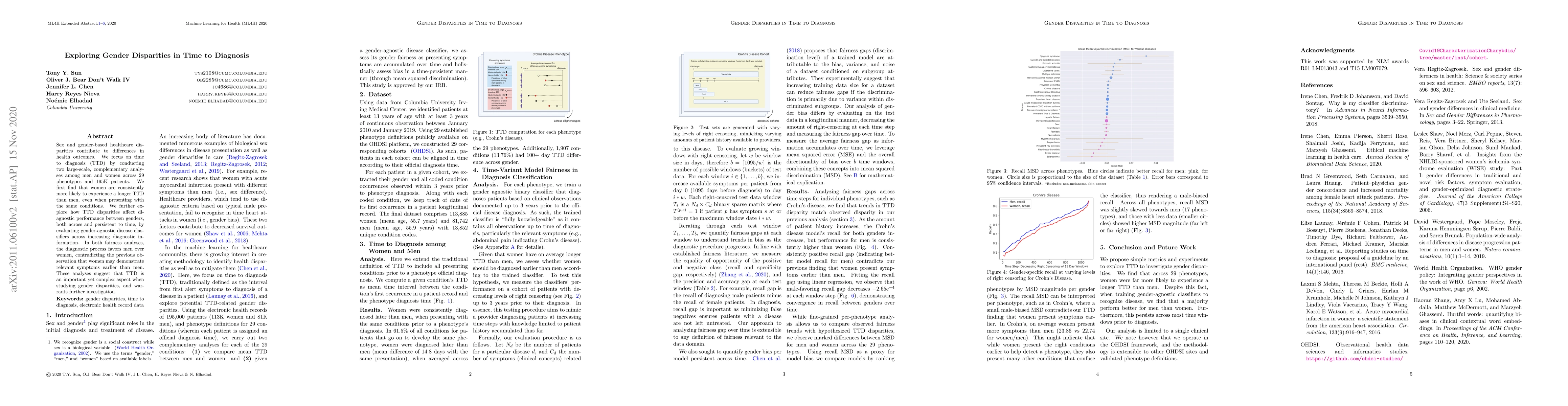 This paper investigates gender disparities in time to diagnosis (TTD) across 29 phenotypes and 195K patients, revealing that women consistently experience longer TTD than men. Further analysis shows that diagnostic tools favor men, contradicting earlier findings, highlighting the complexity of TTD in gender disparities.