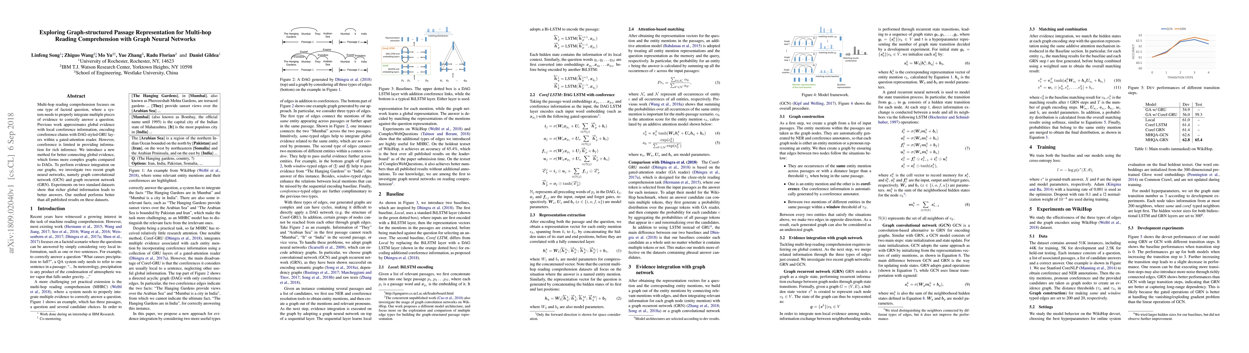 This paper proposes a graph-structured passage representation for multi-hop reading comprehension using graph neural networks, specifically GCN and GRN, to better integrate global evidence than previous coreference-based methods. Experimental results demonstrate superior performance on standard datasets.