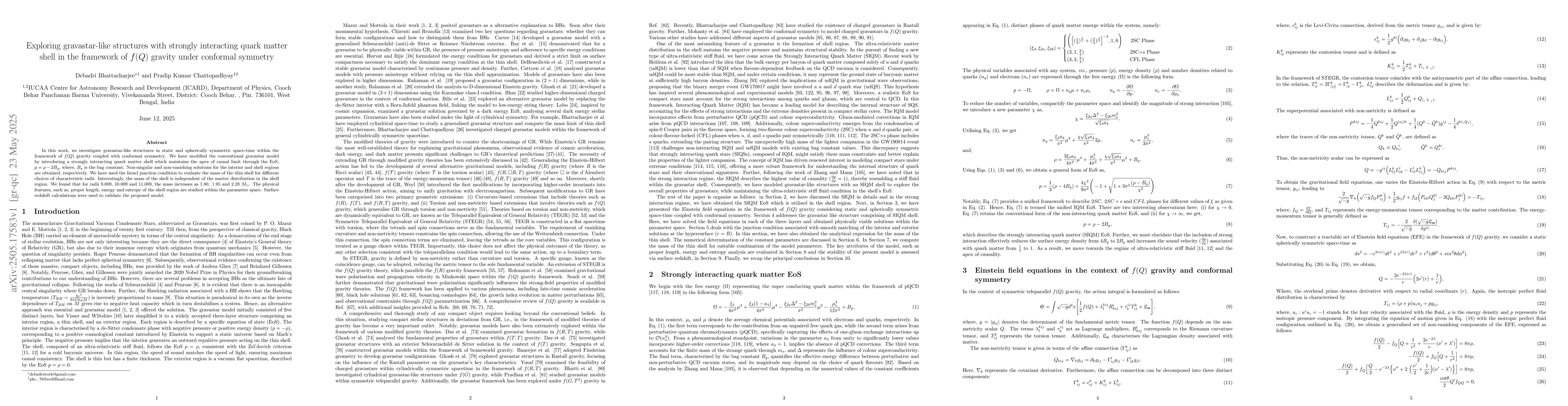 The research investigates gravastar-like structures in static and spherically symmetric spacetime within $f(Q)$ gravity framework, coupled with conformal symmetry. It modifies the conventional gravastar model by introducing a strongly interacting quark matter shell, using the Israel junction condition for shell mass evaluation.