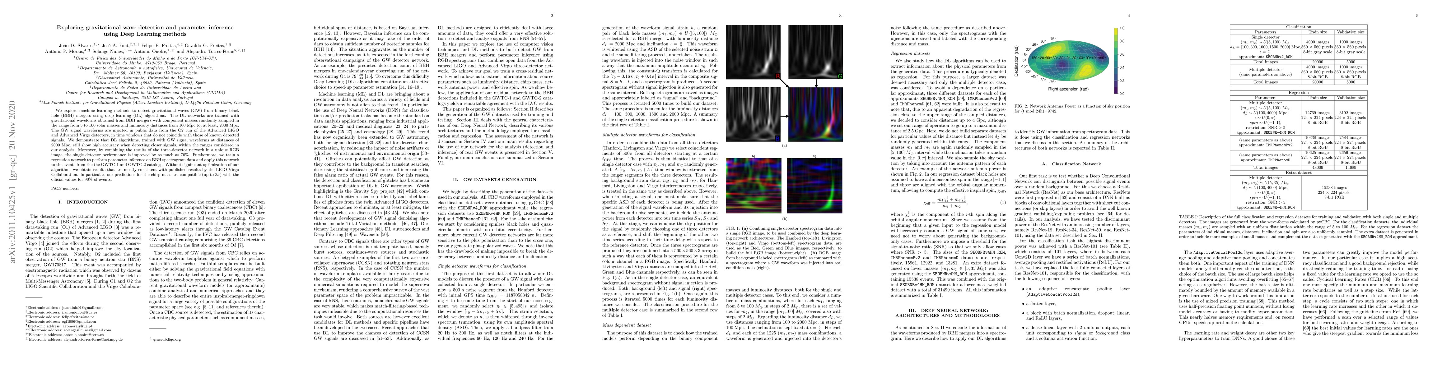 We explore machine learning methods to detect gravitational waves (GW) from binary black hole (BBH) mergers using deep learning (DL) algorithms. The DL networks are trained with gravitational waveforms obtained from BBH mergers with component masses randomly sampled in the range from 5 to 100 solar masses and luminosity distances from 100 Mpc to, at least, 2000 Mpc. The GW signal waveforms are injected in public data from the O2 run of the Advanced LIGO and Advanced Virgo detectors, in time windows that do not coincide with those of known detected signals. We demonstrate that DL algorithms, trained with GW signal waveforms at distances of 2000 Mpc, still show high accuracy when detecting closer signals, within the ranges considered in our analysis. Moreover, by combining the results of the three-detector network in a unique RGB image, the single detector performance is improved by as much as 70%. Furthermore, we train a regression network to perform parameter inference on BBH spectrogram data and apply this network to the events from the the GWTC-1 and GWTC-2 catalogs. Without significant optimization of our algorithms we obtain results that are mostly consistent with published results by the LIGO-Virgo Collaboration. In particular, our predictions for the chirp mass are compatible (up to 3$\sigma$) with the official values for 90% of events