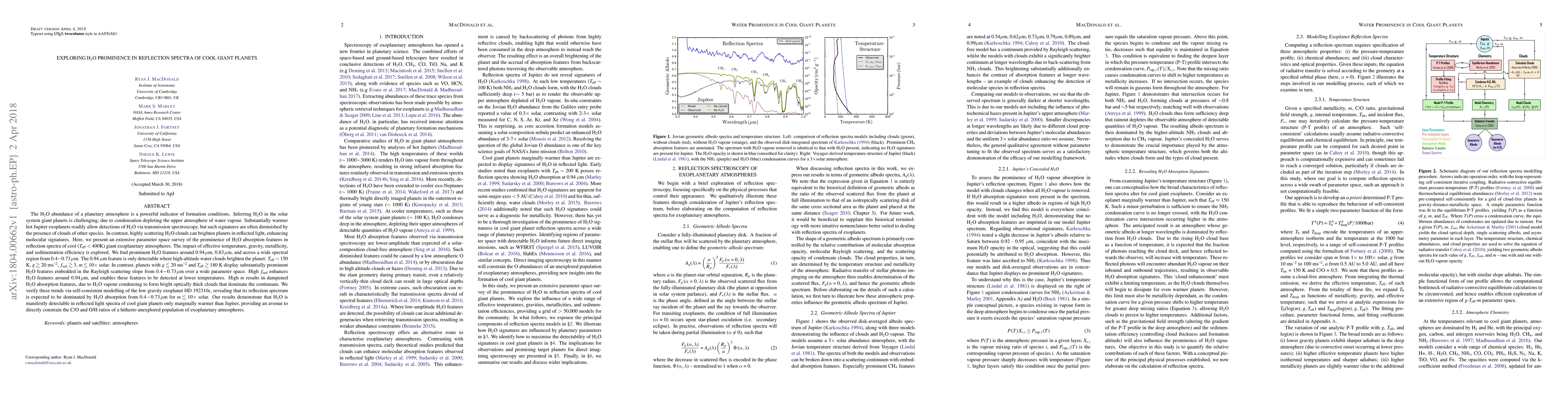 The H2O abundance of a planetary atmosphere is a powerful indicator of formation conditions. Inferring H2O in the solar system giant planets is challenging, due to condensation depleting the upper atmosphere of water vapour. Substantially warmer hot Jupiter exoplanets readily allow detections of H2O via transmission spectroscopy, but such signatures are often diminished by the presence of clouds made of other species. In contrast, highly scattering H2O clouds can brighten planets in reflected light, enhancing molecular signatures. Here, we present an extensive parameter space survey of the prominence of H2O absorption features in reflection spectra of cool (Teff<400K) giant exoplanetary atmospheres. The impact of effective temperature, gravity, metallicity, and sedimentation efficiency is explored. We find prominent H2O features around 0.94um, 0.83um, and across a wide spectral region from 0.4-0.73um. The 0.94um feature is only detectable where high-altitude water clouds brighten the planet: T~150K, g>~20m/s^2, fsed>~3, m<~10xsolar. In contrast, planets with g<~20m/s^2 and T>~180K display prominent H2O features embedded in the Rayleigh slope from 0.4-0.73um. High fsed enhances H2O features around 0.94um, and enables them to be detected at lower temperatures. High m results in dampened H2O absorption features, due to H2O vapour condensing to form bright optically thick clouds that dominate the continuum. We verify these trends via self-consistent modelling of the low gravity exoplanet HD 192310c, revealing that its reflection spectrum is expected to be dominated by H2O absorption from 0.4-0.73um for m<~10xsolar. Our results demonstrate that H2O is manifestly detectable in reflected light spectra of cool giant planets only marginally warmer than Jupiter, providing an avenue to directly constrain the C/O and O/H ratios of a hitherto unexplored population of exoplanetary atmospheres.