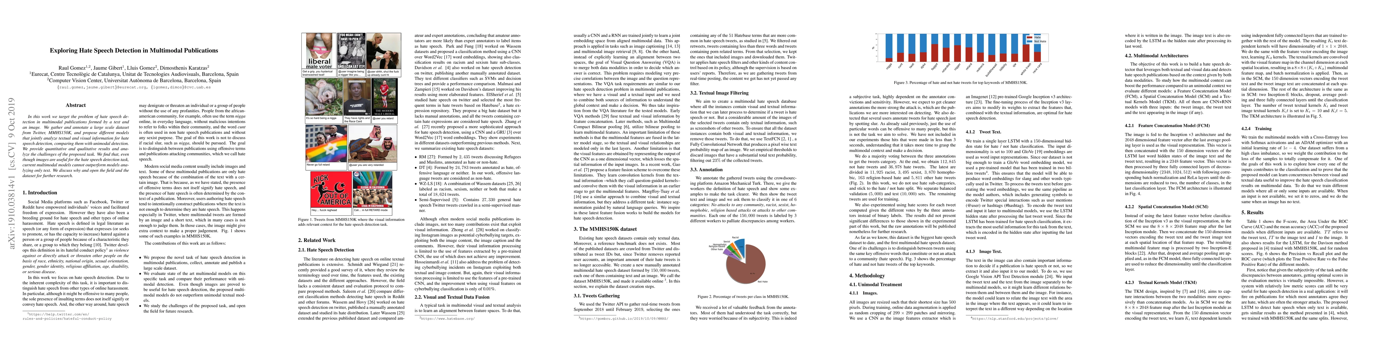 In this work we target the problem of hate speech detection in multimodal publications formed by a text and an image. We gather and annotate a large scale dataset from Twitter, MMHS150K, and propose different models that jointly analyze textual and visual information for hate speech detection, comparing them with unimodal detection. We provide quantitative and qualitative results and analyze the challenges of the proposed task. We find that, even though images are useful for the hate speech detection task, current multimodal models cannot outperform models analyzing only text. We discuss why and open the field and the dataset for further research.
