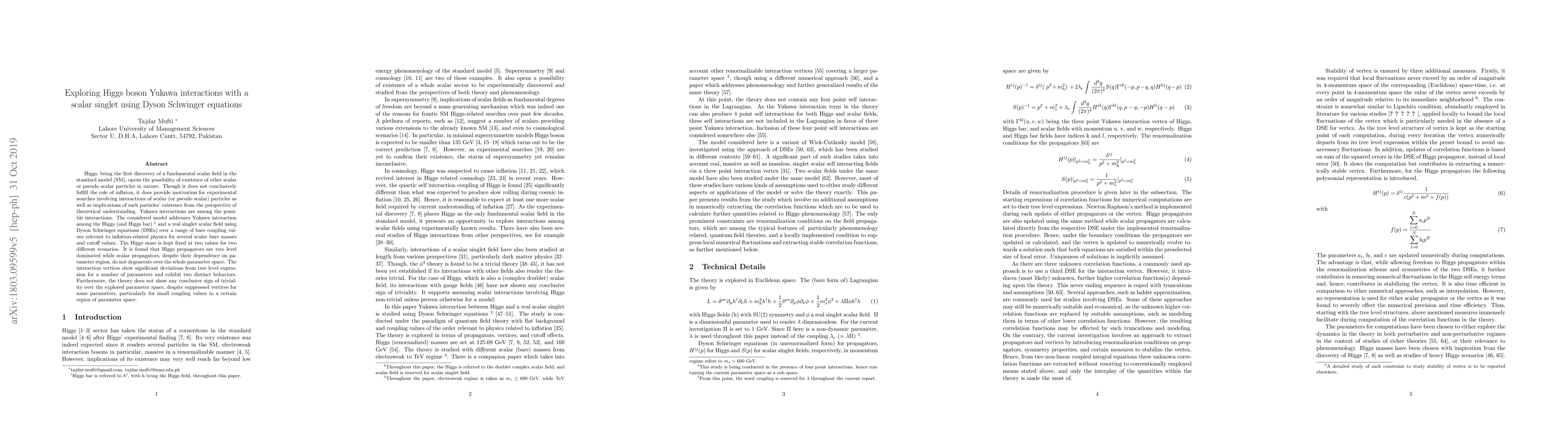 Higgs, being the first discovery of a fundamental scalar field in the standard model (SM), opens the possibility of existence of other scalar or pseudo scalar particles in nature. Though it does not conclusively fulfill the role of inflaton, it does provide motivation for experimental searches involving interactions of scalar (or pseudo scalar) particles as well as implications of such particles' existence from the perspective of theoretical understanding. Yukawa interactions are among the possible interactions. The considered model addresses Yukawa interaction among the Higgs (and Higgs bar) and a real singlet scalar field using Dyson Schwinger equations (DSEs) over a range of bare coupling values relevant to inflation-related physics for several scalar bare masses and cutoff values. The Higgs mass is kept fixed at two values for two different scenarios. It is found that Higgs propagators are tree level dominated while scalar propagators, despite their dependence on parameter region, do not degenerate over the whole parameter space. The interaction vertices show significant deviations from tree level expression for a number of parameters and exhibit two distinct behaviors. Furthermore, the theory does not show any conclusive sign of triviality over the explored parameter space, despite suppressed vertices for some parameters, particularly for small coupling values in a certain region of parameter space.