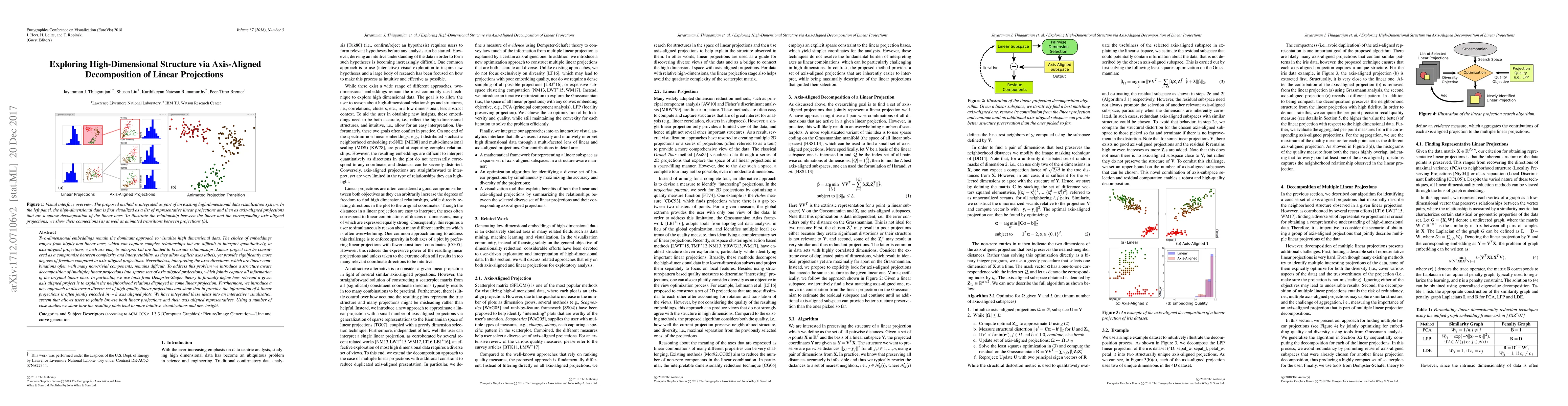 This paper proposes a method to decompose linear projections into sparse sets of axis-aligned projections to better interpret high-dimensional data. It uses Dempster-Shafer theory to determine the relevance of axis-aligned projections and introduces an interactive visualization system to explore both types of projections, leading to more intuitive insights.