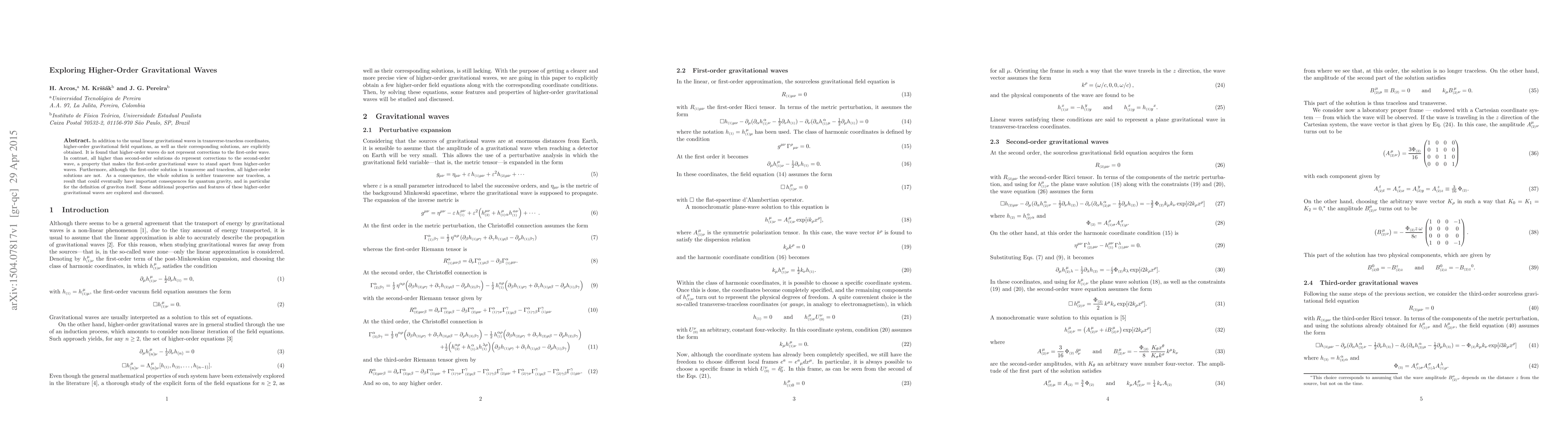In addition to the usual linear gravitational waves in transverse-traceless coordinates, higher-order gravitational field equations, as well as their corresponding solutions, are explicitly obtained. It is found that higher-order waves do not represent corrections to the first-order wave. In contrast, all higher than second-order solutions do represent corrections to the second-order wave, a property that makes the first-order gravitational wave to stand apart from higher-order waves. Furthermore, although the first-order solution is transverse and traceless, all higher-order solutions are not. As a consequence, the whole solution is neither transverse nor traceless, a result that could eventually have important consequences for quantum gravity, and in particular for the definition of graviton itself. Some additional properties and features of these higher-order gravitational waves are explored and discussed.