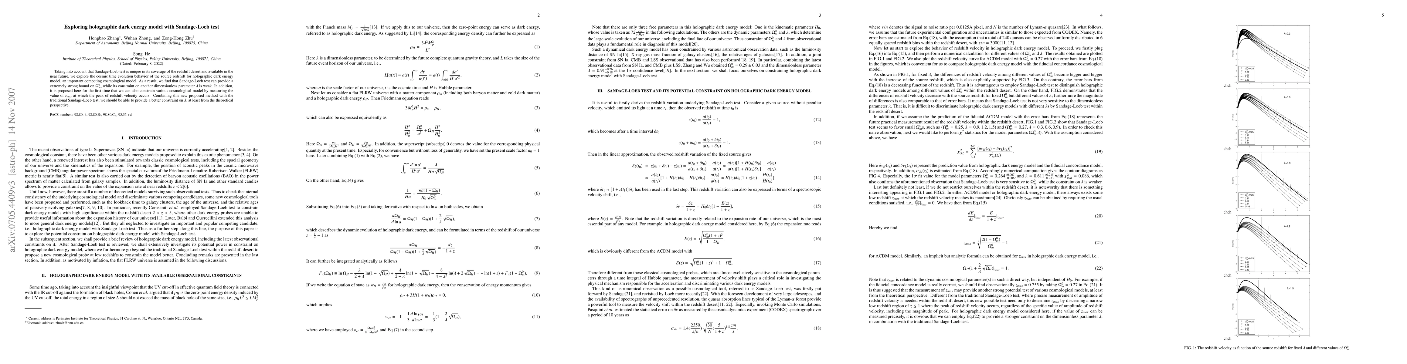 This paper investigates the cosmic time evolution of holographic dark energy using the Sandage-Loeb test, finding strong constraints on $\Omega^0_m$ but weak constraints on $\lambda$. It proposes a new method to constrain cosmological models by measuring $z_{max}$, suggesting that combining this with the traditional test could improve $\lambda$ constraints.