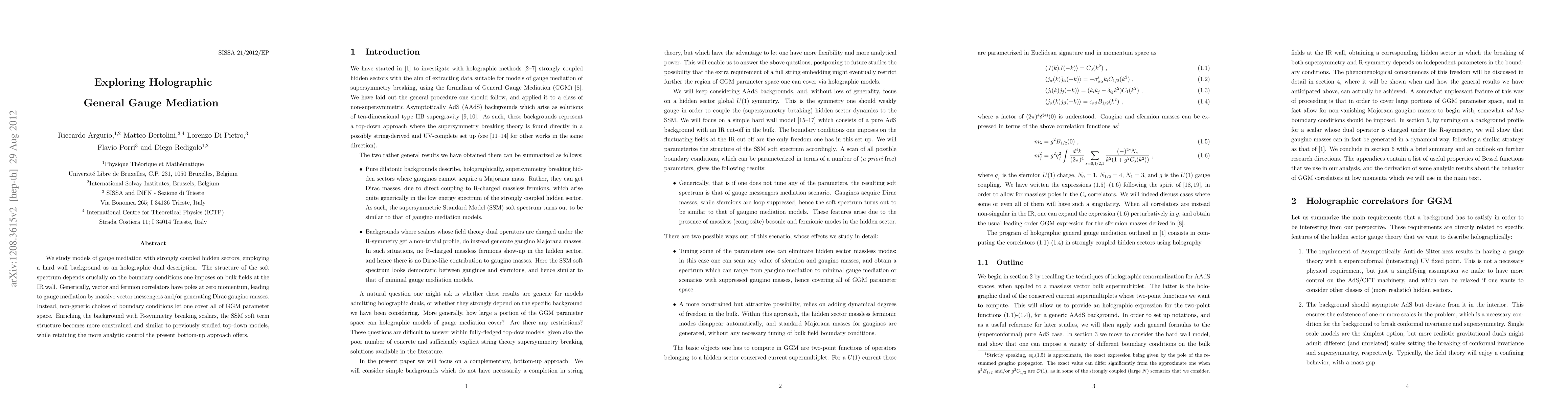 We study models of gauge mediation with strongly coupled hidden sectors, employing a hard wall background as an holographic dual description. The structure of the soft spectrum depends crucially on the boundary conditions one imposes on bulk fields at the IR wall. Generically, vector and fermion correlators have poles at zero momentum, leading to gauge mediation by massive vector messengers and/or generating Dirac gaugino masses. Instead, non-generic choices of boundary conditions let one cover all of GGM parameter space. Enriching the background with R-symmetry breaking scalars, the SSM soft term structure becomes more constrained and similar to previously studied top-down models, while retaining the more analytic control the present bottom-up approach offers.