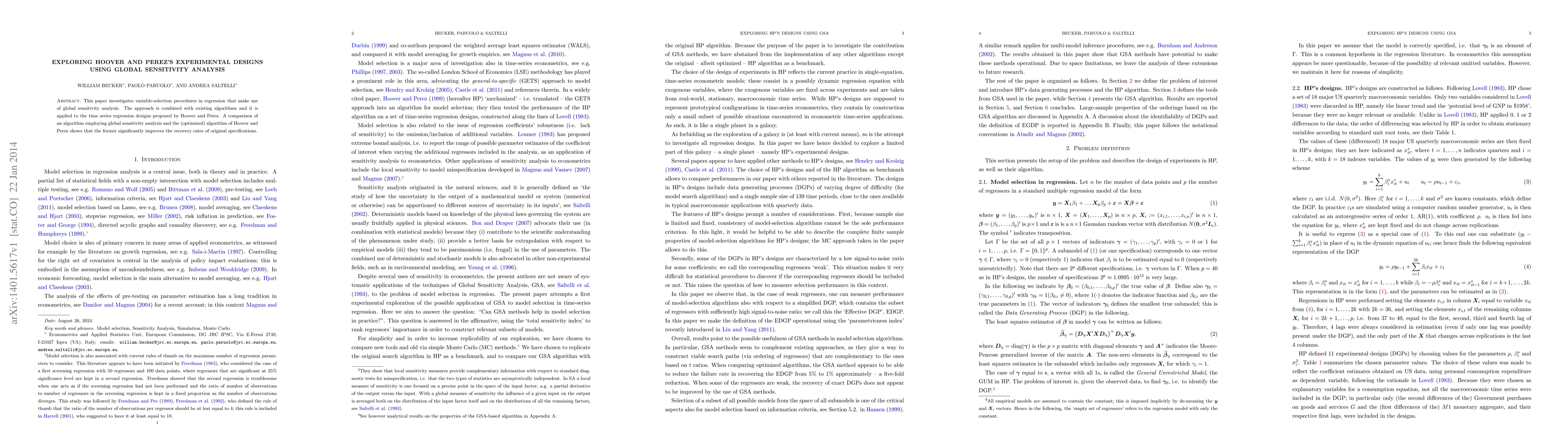 This paper explores the application of global sensitivity analysis to enhance variable-selection procedures in regression, specifically in Hoover and Perez's time series designs. The results indicate that global sensitivity analysis significantly improves recovery rates compared to the optimized Hoover and Perez algorithm.