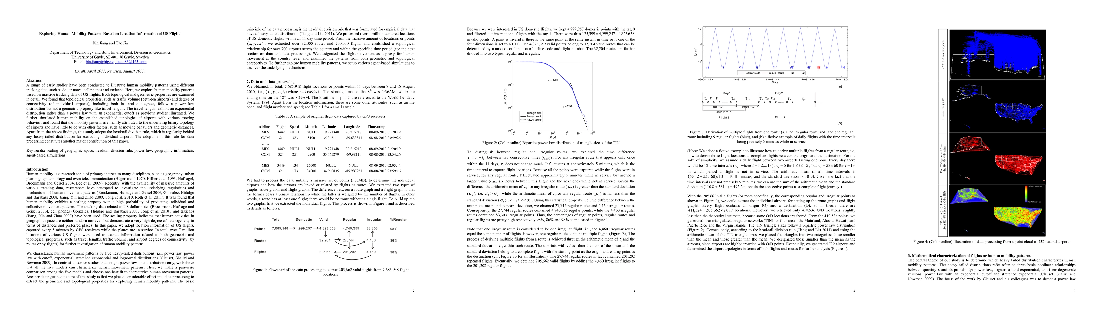 A range of early studies have been conducted to illustrate human mobility patterns using different tracking data, such as dollar notes, cell phones and taxicabs. Here, we explore human mobility patterns based on massive tracking data of US flights. Both topological and geometric properties are examined in detail. We found that topological properties, such as traffic volume (between airports) and degree of connectivity (of individual airports), including both in- and outdegrees, follow a power law distribution but not a geometric property like travel lengths. The travel lengths exhibit an exponential distribution rather than a power law with an exponential cutoff as previous studies illustrated. We further simulated human mobility on the established topologies of airports with various moving behaviors and found that the mobility patterns are mainly attributed to the underlying binary topology of airports and have little to do with other factors, such as moving behaviors and geometric distances. Apart from the above findings, this study adopts the head/tail division rule, which is regularity behind any heavy-tailed distribution for extracting individual airports. The adoption of this rule for data processing constitutes another major contribution of this paper. Keywords: scaling of geographic space, head/tail division rule, power law, geographic information, agent-based simulations