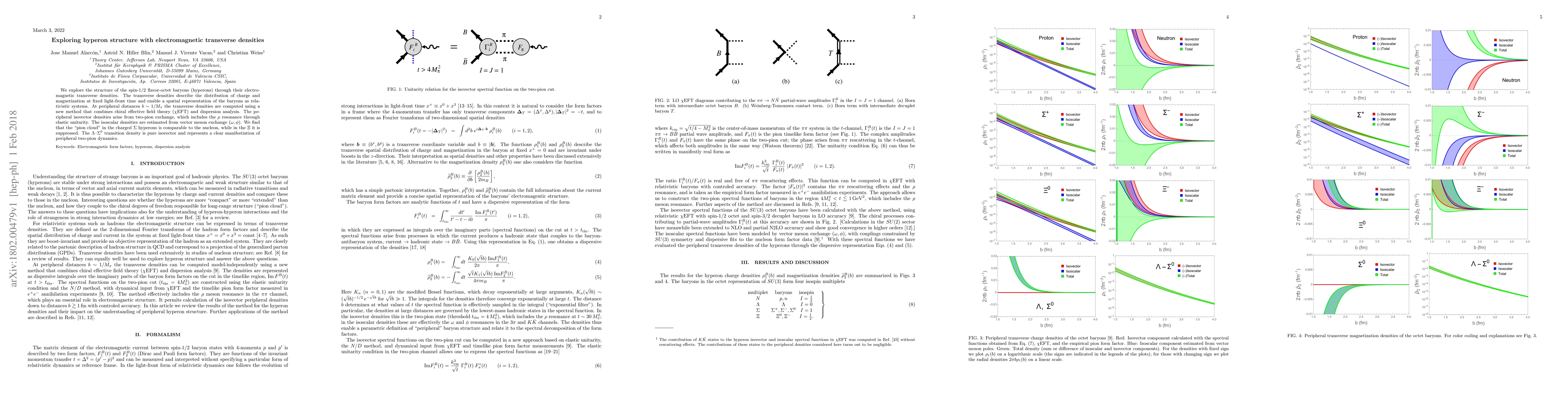 This paper investigates the electromagnetic transverse densities of hyperons to reveal their internal structure. It employs a novel method combining chiral effective field theory and dispersion analysis to compute densities at peripheral distances, highlighting the role of pion clouds and two-pion exchange dynamics in charged hyperons.