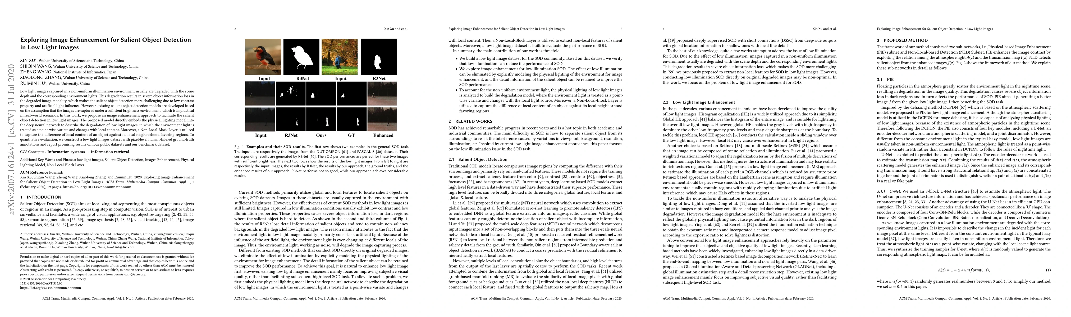 This paper proposes an image enhancement method to improve salient object detection in low light images by embedding a physical lighting model into a deep neural network. The model captures local content differences and is evaluated on a newly constructed dataset and four public datasets, showing promising results.