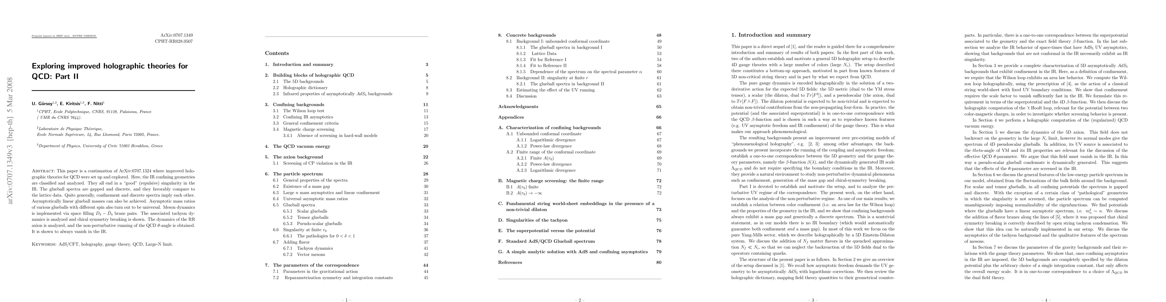 This paper is a continuation of ArXiv:0707.1324 where improved holographic theories for QCD were set up and explored. Here, the IR confining geometries are classified and analyzed. They all end in a "good" (repulsive) singularity in the IR. The glueball spectra are gaped and discrete, and they favorably compare to the lattice data. Quite generally, confinement and discrete spectra imply each other. Asymptotically linear glueball masses can also be achieved. Asymptotic mass ratios of various glueballs with different spin also turn out to be universal. Mesons dynamics is implemented via space filling D4-anti-D4 brane pairs. The associated tachyon dynamics is analyzed and chiral symmetry breaking is shown. The dynamics of the RR axion is analyzed, and the non-perturbative running of the QCD theta-angle is obtained. It is shown to always vanish in the IR.