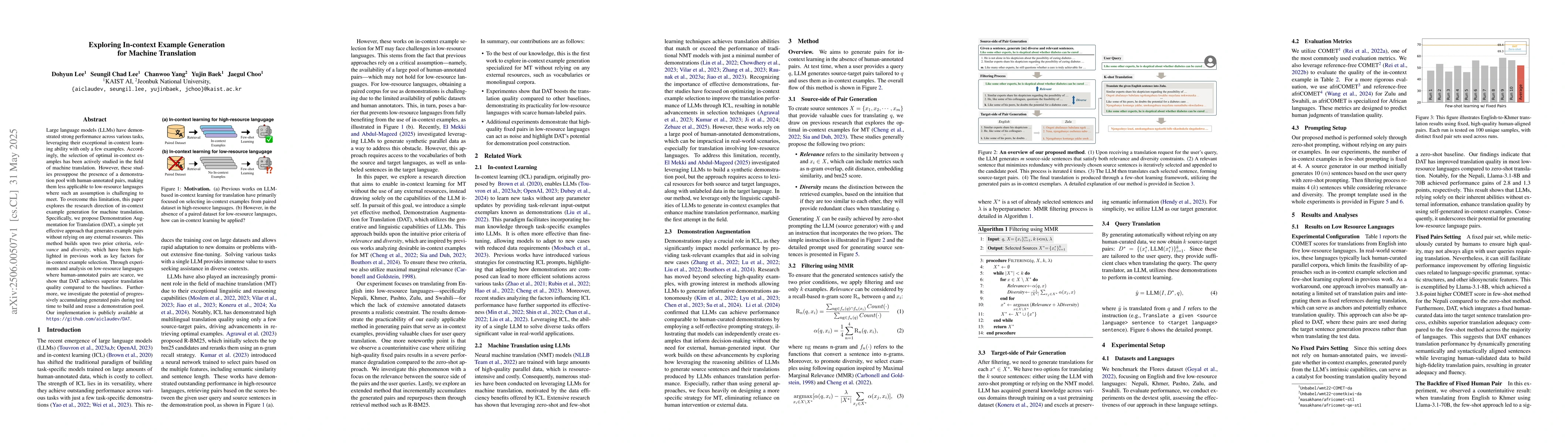 This paper proposes Demonstration Augmentation for Translation (DAT), a method that generates in-context example pairs for machine translation without relying on external resources, using relevance and diversity criteria.