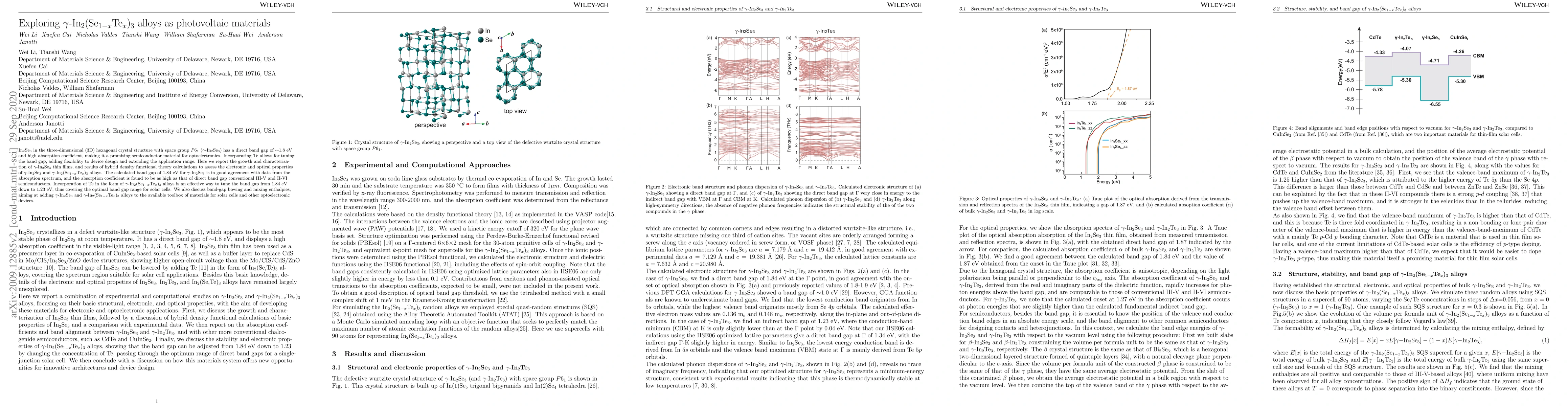 This research explores $\gamma$-In$_2$Se$_3$ and $\gamma$-In$_2$(Se$_{1-x}$Te$_x$)$_3$ alloys as promising photovoltaic materials, showing that the band gap can be tuned from 1.84 eV to 1.23 eV by incorporating Te, thus optimizing them for solar cell applications. The high absorption coefficient and good band gap alignment support their potential in optoelectronics.