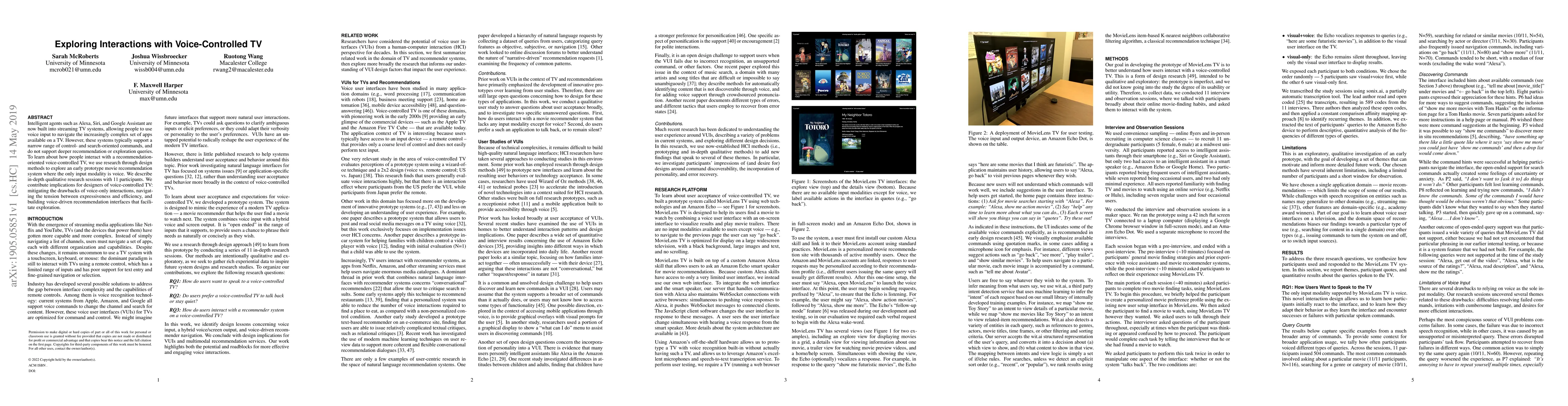 The paper presents a voice-only movie recommendation system prototype, MovieLensTV, and analyzes user interactions to derive design guidelines for voice-controlled TV interfaces.