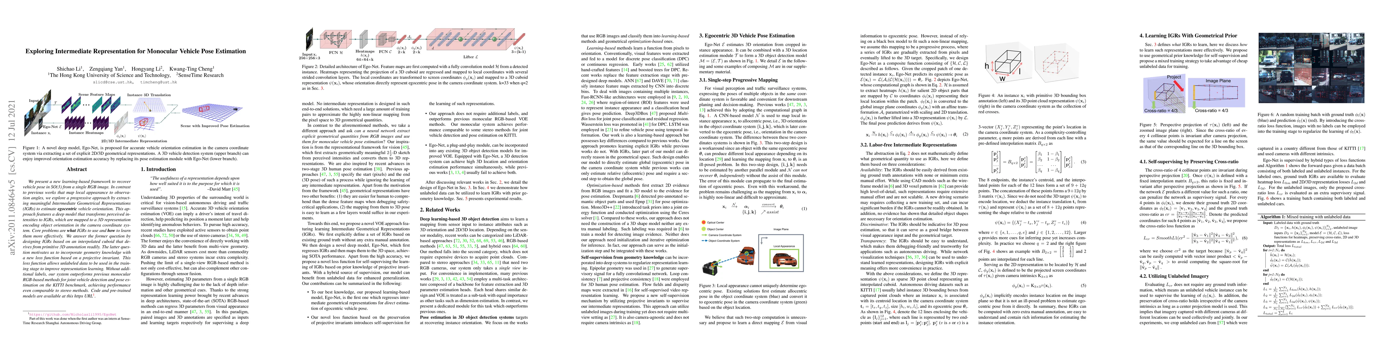 We present a new learning-based framework to recover vehicle pose in SO(3) from a single RGB image. In contrast to previous works that map from local appearance to observation angles, we explore a progressive approach by extracting meaningful Intermediate Geometrical Representations (IGRs) to estimate egocentric vehicle orientation. This approach features a deep model that transforms perceived intensities to IGRs, which are mapped to a 3D representation encoding object orientation in the camera coordinate system. Core problems are what IGRs to use and how to learn them more effectively. We answer the former question by designing IGRs based on an interpolated cuboid that derives from primitive 3D annotation readily. The latter question motivates us to incorporate geometry knowledge with a new loss function based on a projective invariant. This loss function allows unlabeled data to be used in the training stage to improve representation learning. Without additional labels, our system outperforms previous monocular RGB-based methods for joint vehicle detection and pose estimation on the KITTI benchmark, achieving performance even comparable to stereo methods. Code and pre-trained models are available at this https URL.