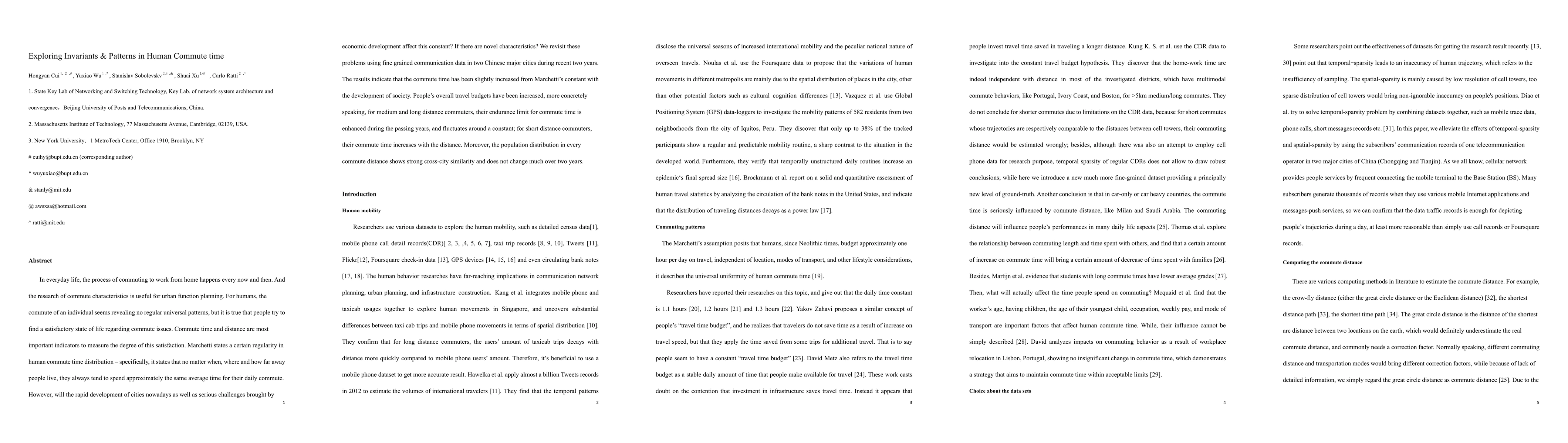 Research in commute characteristics reveals that despite societal development, humans tend to spend the same average time for daily commutes, with slight variations in distance and budget; population distribution patterns remain similar across cities.