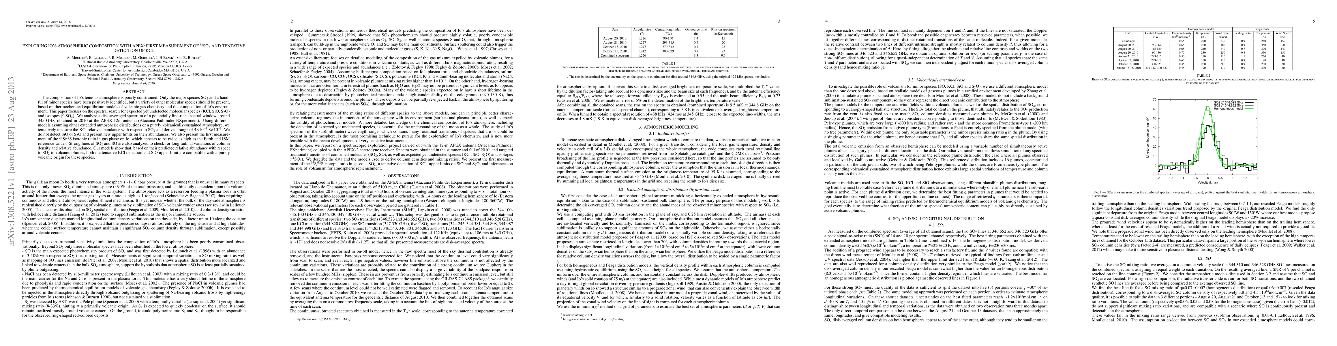 This research used the APEX-12m antenna to analyze Io's atmosphere, first detecting 34SO2 and tentatively identifying KCl. It also found Io's 34S/32S ratio is higher than Earth's. No SiO or S2O were detected, and the study suggests volcanic origin for these species.