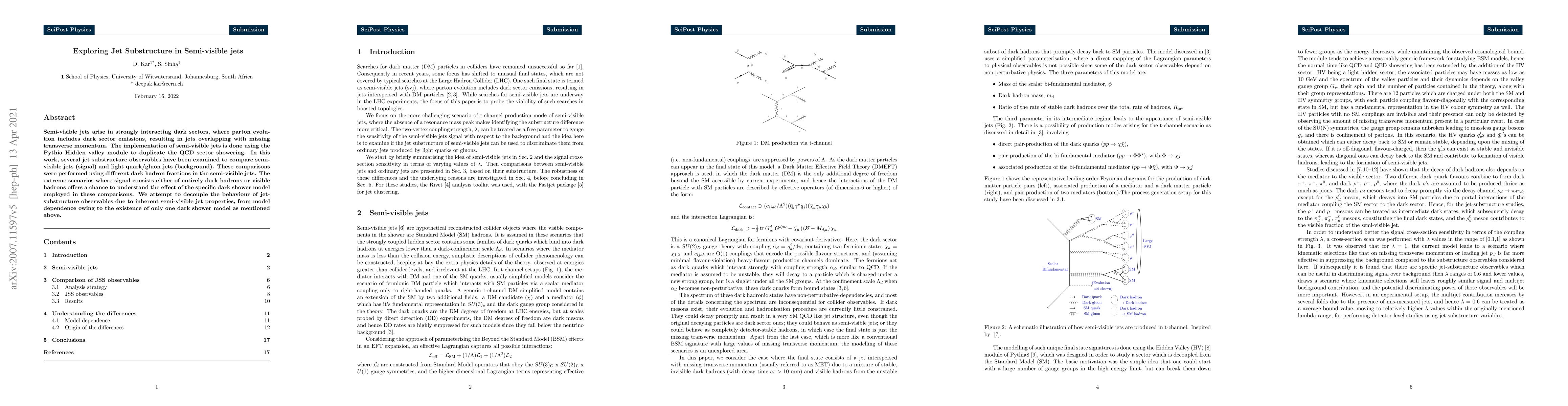 Semi-visible jets arise in strongly interacting dark sectors, where parton evolution includes dark sector emissions, resulting in jets overlapping with missing transverse momentum. The implementation of semi-visible jets is done using the Pythia Hidden valley module to duplicate the QCD sector showering. In this work, several jet substructure observables have been examined to compare semi-visible jets and light quark/gluon jets. These comparisons were performed using different dark hadron fraction in the semi-visible jets (signal). The extreme scenarios where signal consists either of entirely dark hadrons or visible hadrons offers a chance to understand the effect of the specific dark shower model employed in these comparisons. We attempt to decouple the behaviour of jet-substructure observables due to inherent semi-visible jet properties, from model dependence owing to the existence of only one dark shower model as mentioned above.