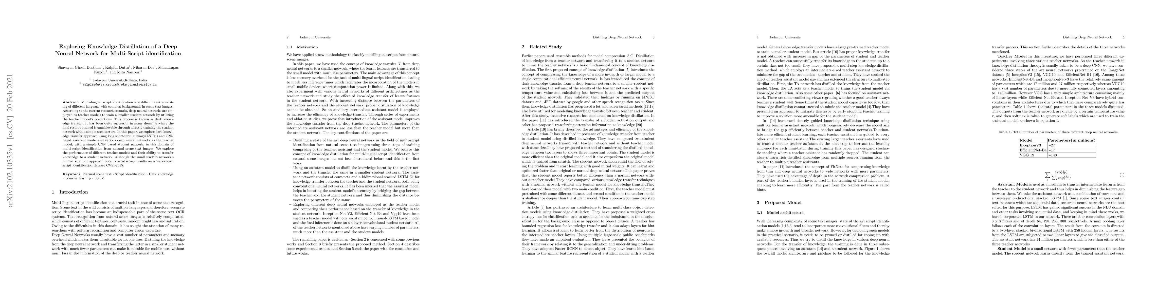 Multi-lingual script identification is a difficult task consisting of different language with complex backgrounds in scene text images. According to the current research scenario, deep neural networks are employed as teacher models to train a smaller student network by utilizing the teacher model's predictions. This process is known as dark knowledge transfer. It has been quite successful in many domains where the final result obtained is unachievable through directly training the student network with a simple architecture. In this paper, we explore dark knowledge transfer approach using long short-term memory(LSTM) and CNN based assistant model and various deep neural networks as the teacher model, with a simple CNN based student network, in this domain of multi-script identification from natural scene text images. We explore the performance of different teacher models and their ability to transfer knowledge to a student network. Although the small student network's limited size, our approach obtains satisfactory results on a well-known script identification dataset CVSI-2015.