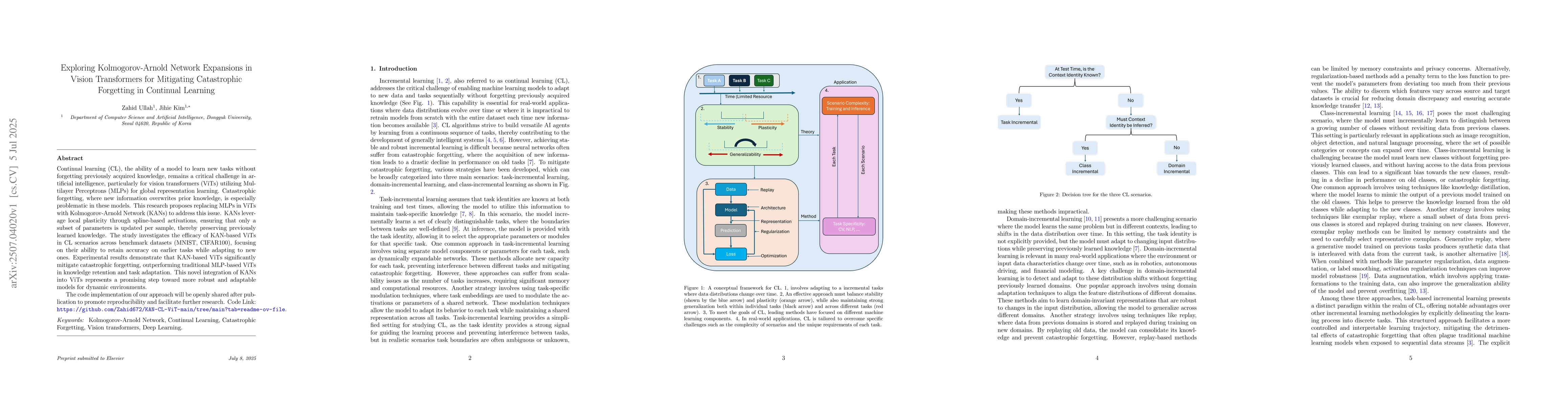 Continual learning (CL), the ability of a model to learn new tasks without forgetting previously acquired knowledge, remains a critical challenge in artificial intelligence, particularly for vision transformers (ViTs) utilizing Multilayer Perceptrons (MLPs) for global representation learning. Catastrophic forgetting, where new information overwrites prior knowledge, is especially problematic in these models. This research proposes replacing MLPs in ViTs with Kolmogorov-Arnold Network (KANs) to address this issue. KANs leverage local plasticity through spline-based activations, ensuring that only a subset of parameters is updated per sample, thereby preserving previously learned knowledge. The study investigates the efficacy of KAN-based ViTs in CL scenarios across benchmark datasets (MNIST, CIFAR100), focusing on their ability to retain accuracy on earlier tasks while adapting to new ones. Experimental results demonstrate that KAN-based ViTs significantly mitigate catastrophic forgetting, outperforming traditional MLP-based ViTs in knowledge retention and task adaptation. This novel integration of KANs into ViTs represents a promising step toward more robust and adaptable models for dynamic environments.