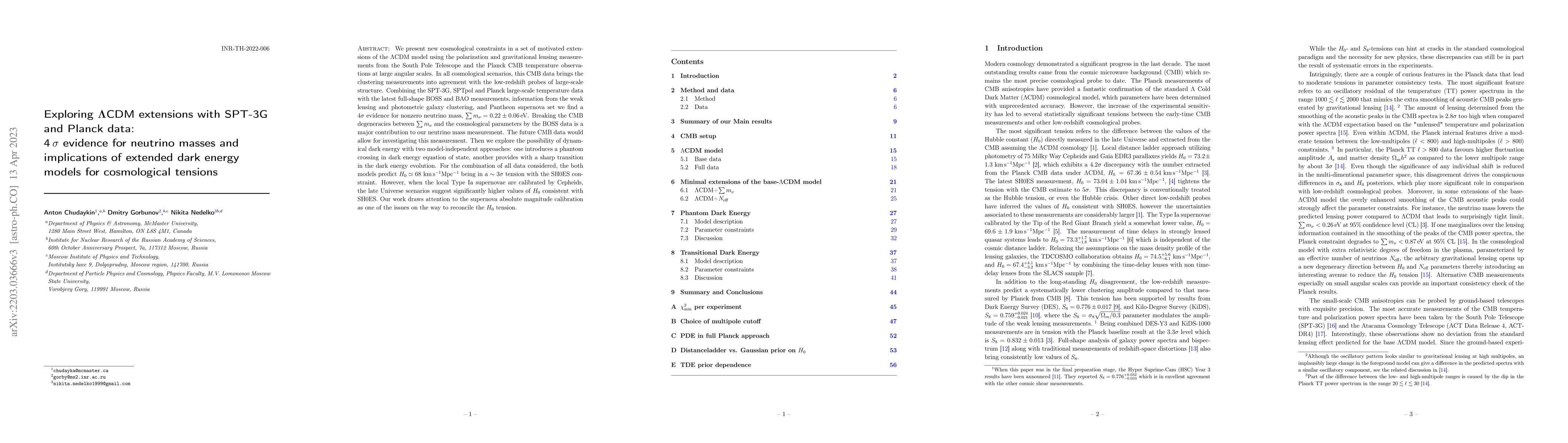 This paper presents new cosmological constraints from SPT-3G and Planck data, finding $4\sigma$ evidence for nonzero neutrino masses ($\sum m_\nu=0.22\pm0.06\,{\rm eV}$). It also explores extended dark energy models to address the $H_0$ tension, suggesting supernova calibration issues may play a role.