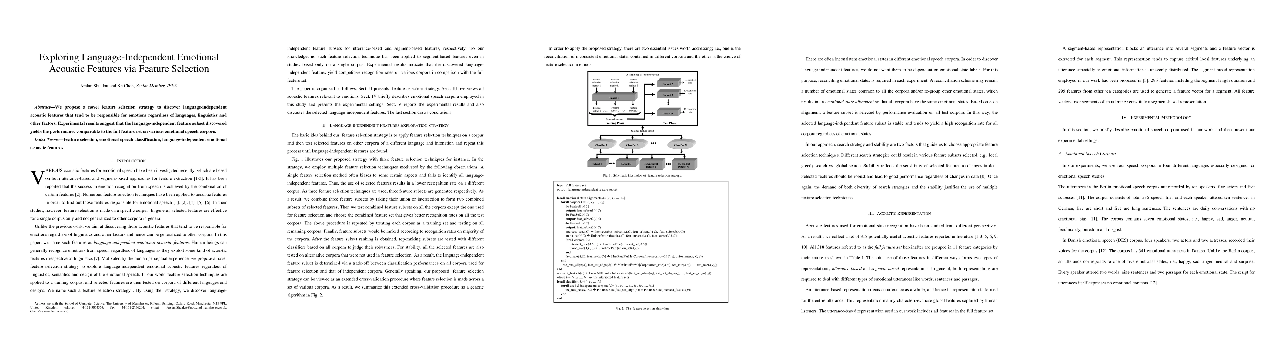 We propose a novel feature selection strategy to discover language-independent acoustic features that tend to be responsible for emotions regardless of languages, linguistics and other factors. Experimental results suggest that the language-independent feature subset discovered yields the performance comparable to the full feature set on various emotional speech corpora.