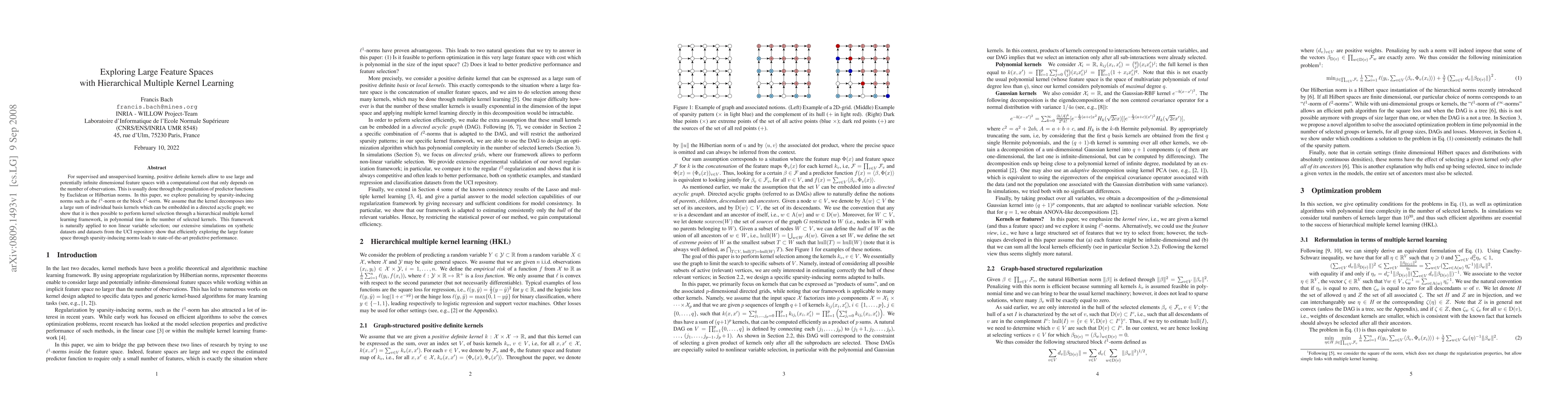 This paper proposes a hierarchical multiple kernel learning framework that uses sparsity-inducing norms for penalization, enabling efficient exploration of large feature spaces. The method allows for kernel selection in polynomial time, leading to state-of-the-art predictive performance on both synthetic and real-world datasets.