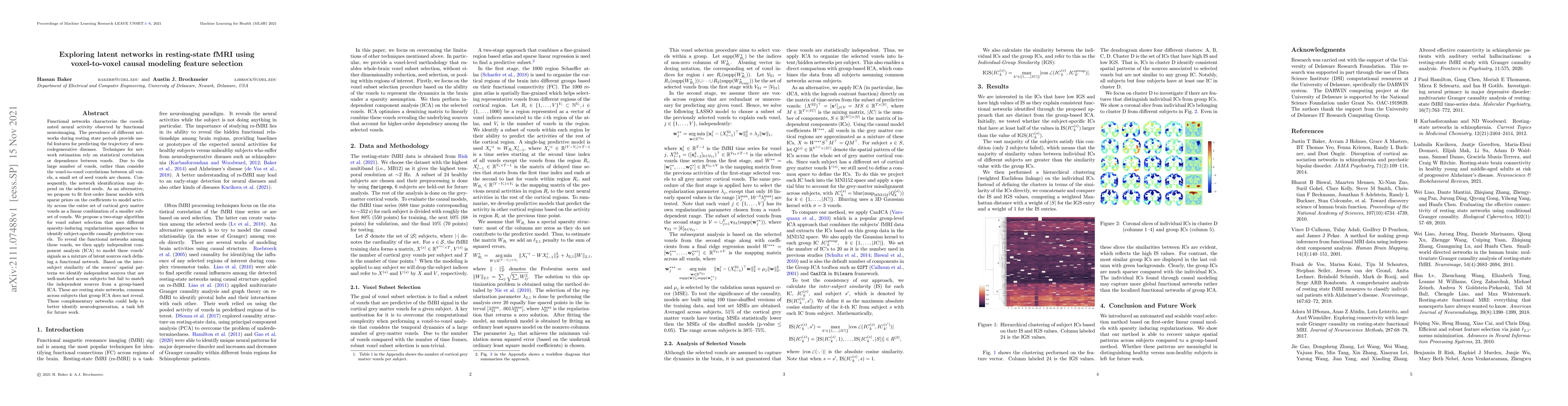 This paper proposes a novel voxel-to-voxel causal modeling approach for identifying latent functional networks in resting-state fMRI data, using sparse linear models and independent component analysis to reveal networks common across subjects that traditional group-based methods miss. The method aims to improve the prediction of neurodegenerative disease trajectories.