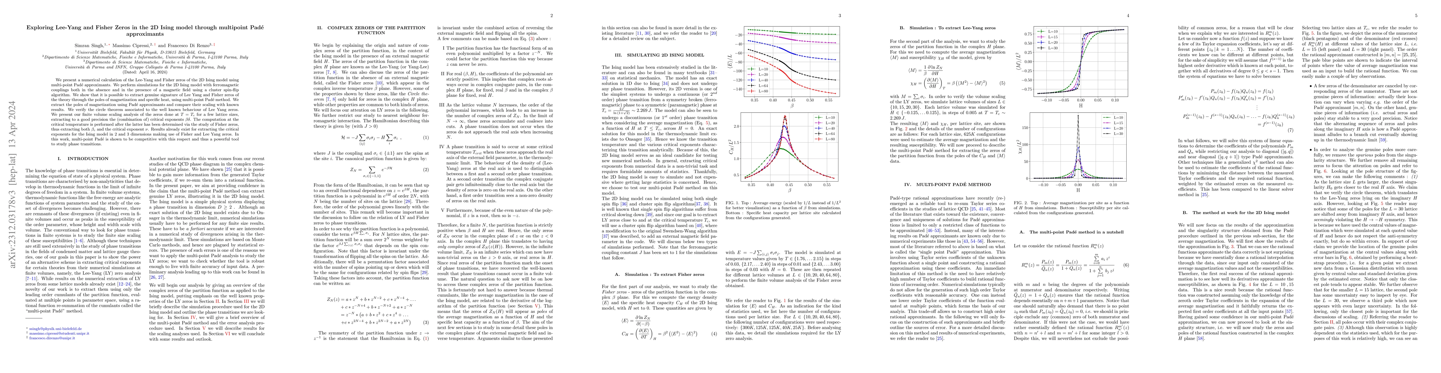 This paper numerically calculates Lee-Yang and Fisher zeros in the 2D Ising model using multi-point Padé approximants. It demonstrates the effectiveness of this method in extracting critical exponents through magnetization and specific heat poles, verifying the circle theorem and presenting a precise finite volume scaling analysis at critical temperature.