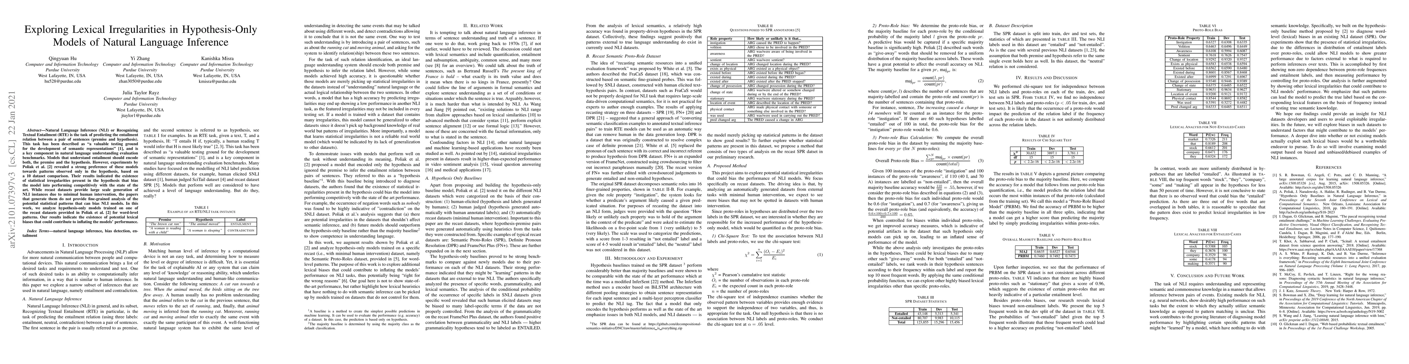 This paper investigates lexical irregularities in hypothesis-only models for Natural Language Inference (NLI), revealing statistical patterns in the hypothesis that bias models toward competitive performance despite not encoding both premise and hypothesis. It finds potential lexical biases in recast datasets that inflate model performance.