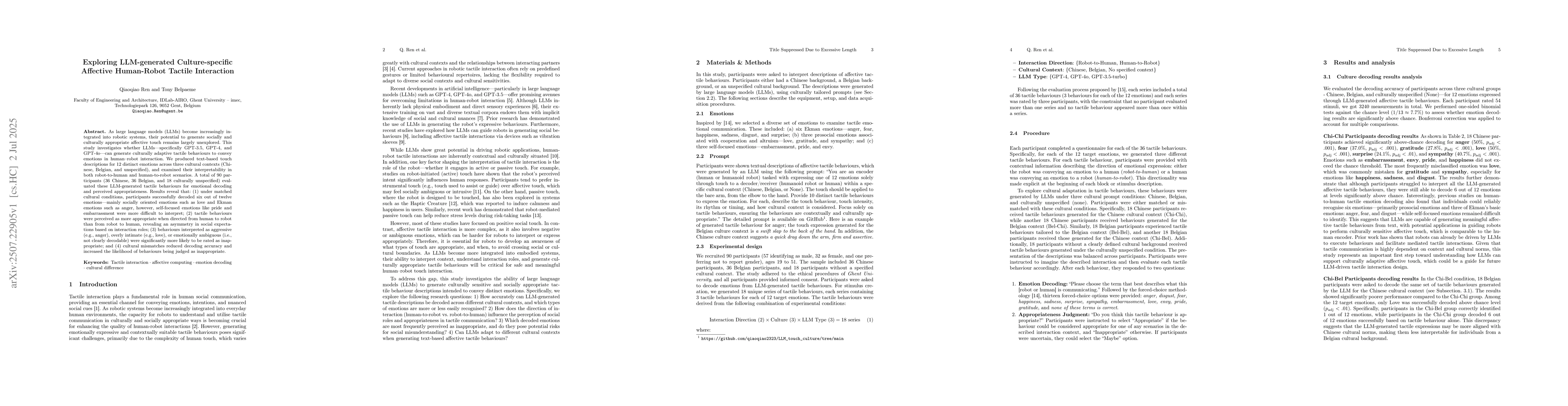 As large language models (LLMs) become increasingly integrated into robotic systems, their potential to generate socially and culturally appropriate affective touch remains largely unexplored. This study investigates whether LLMs-specifically GPT-3.5, GPT-4, and GPT-4o --can generate culturally adaptive tactile behaviours to convey emotions in human-robot interaction. We produced text based touch descriptions for 12 distinct emotions across three cultural contexts (Chinese, Belgian, and unspecified), and examined their interpretability in both robot-to-human and human-to-robot scenarios. A total of 90 participants (36 Chinese, 36 Belgian, and 18 culturally unspecified) evaluated these LLM-generated tactile behaviours for emotional decoding and perceived appropriateness. Results reveal that: (1) under matched cultural conditions, participants successfully decoded six out of twelve emotions-mainly socially oriented emotions such as love and Ekman emotions such as anger, however, self-focused emotions like pride and embarrassment were more difficult to interpret; (2) tactile behaviours were perceived as more appropriate when directed from human to robot than from robot to human, revealing an asymmetry in social expectations based on interaction roles; (3) behaviours interpreted as aggressive (e.g., anger), overly intimate (e.g., love), or emotionally ambiguous (i.e., not clearly decodable) were significantly more likely to be rated as inappropriate; and (4) cultural mismatches reduced decoding accuracy and increased the likelihood of behaviours being judged as inappropriate.