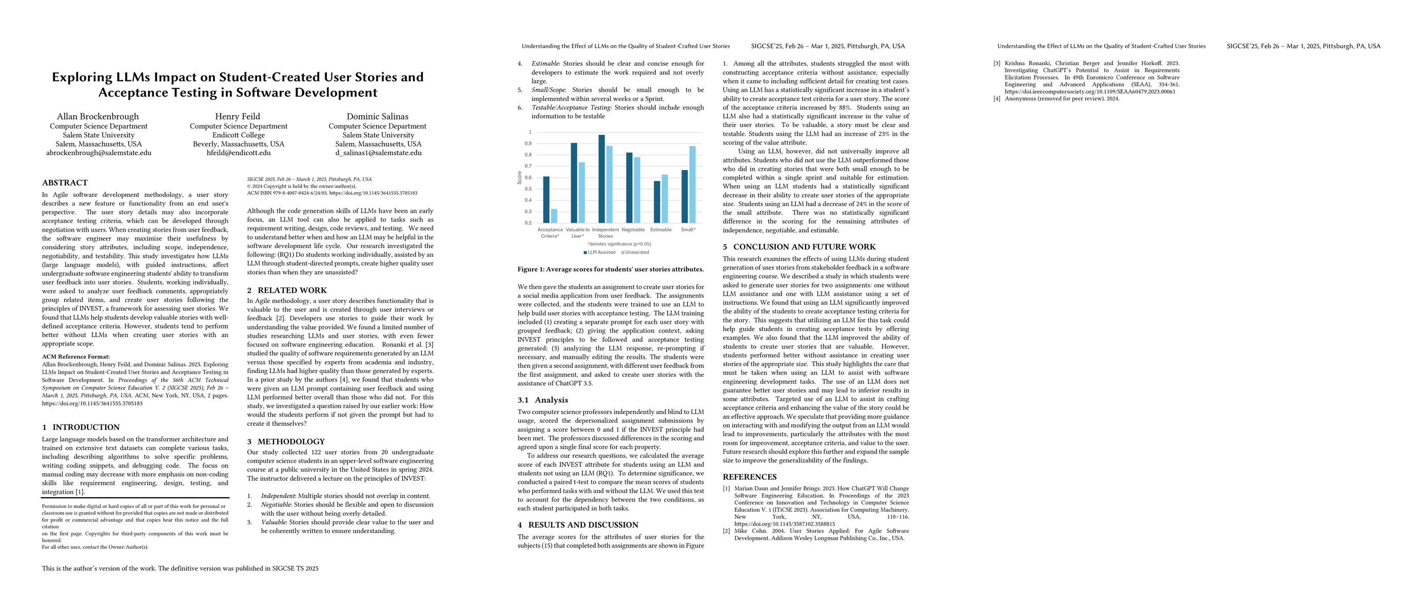The study involved 20 undergraduate students in a software engineering course who created user stories for a social media application from user feedback, both with and without assistance from an LLM (ChatGPT 3.5). Students were trained to use the LLM by creating prompts, providing context, and editing results. Two professors independently scored the stories based on INVEST principles.