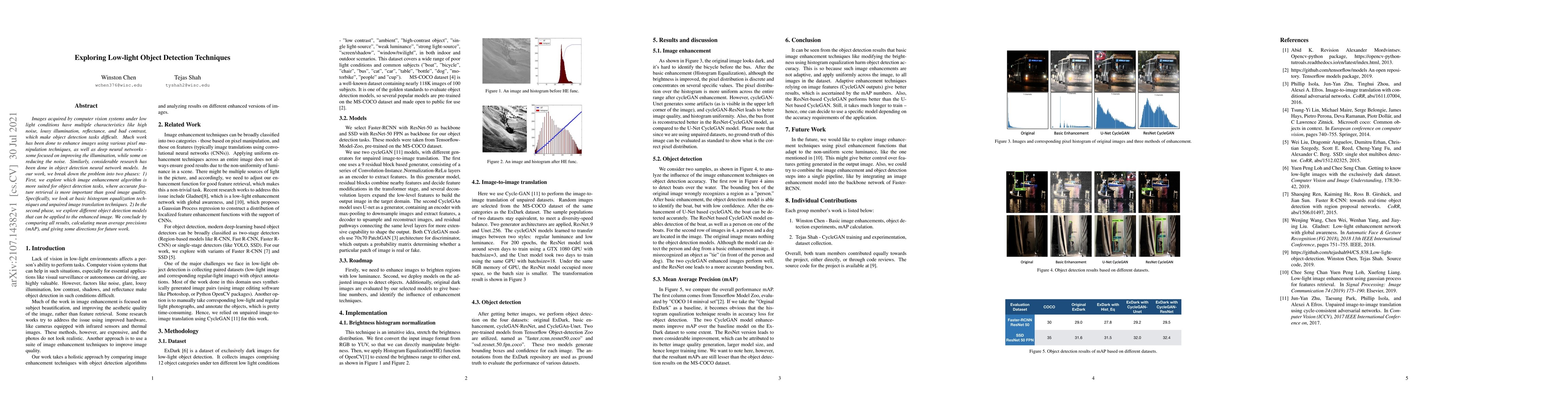 This paper investigates low-light object detection by first evaluating image enhancement techniques like histogram equalization and unpaired image translation for feature retrieval. It then tests various object detection models on the enhanced images, comparing results using mean average precisions (mAP) and suggesting future research directions.