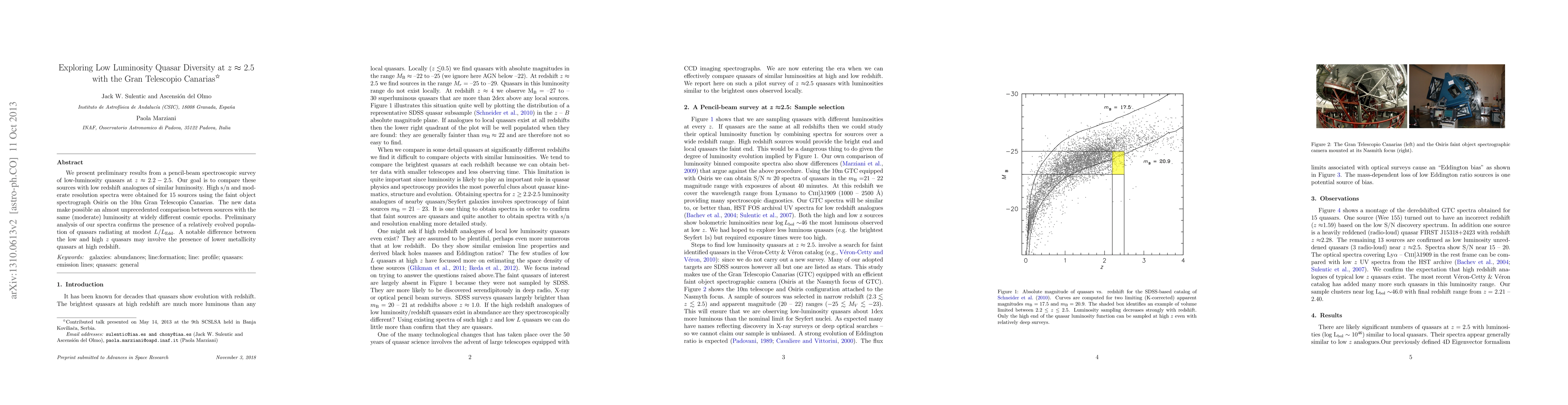 We present preliminary results from a pencil-beam spectroscopic survey of low-luminosity quasars at z ~ 2.2-2.5. Our goal is to compare these sources with low redshift analogues of similar luminosity. High s/n and moderate resolution spectra were obtained for 15 sources using the faint object spectrograph Osiris on the 10m Gran Telescopio Canarias. The new data make possible an almost unprecedented comparison between sources with the same (moderate) luminosity at widely different cosmic epochs. Preliminary analysis of our spectra confirms the presence of a relatively evolved population of quasars radiating at modest Eddington ratios. A notable difference between the low and high z quasars may involve the presence of lower metallicity quasars at high redshift.