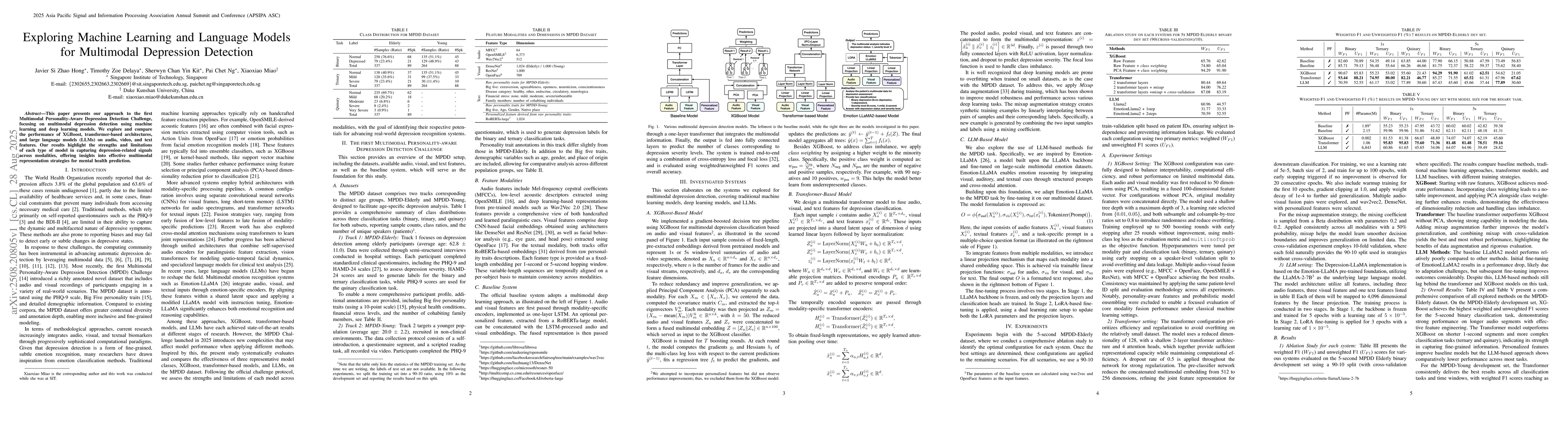 This paper presents our approach to the first Multimodal Personality-Aware Depression Detection Challenge, focusing on multimodal depression detection using machine learning and deep learning models. We explore and compare the performance of XGBoost, transformer-based architectures, and large language models (LLMs) on audio, video, and text features. Our results highlight the strengths and limitations of each type of model in capturing depression-related signals across modalities, offering insights into effective multimodal representation strategies for mental health prediction.