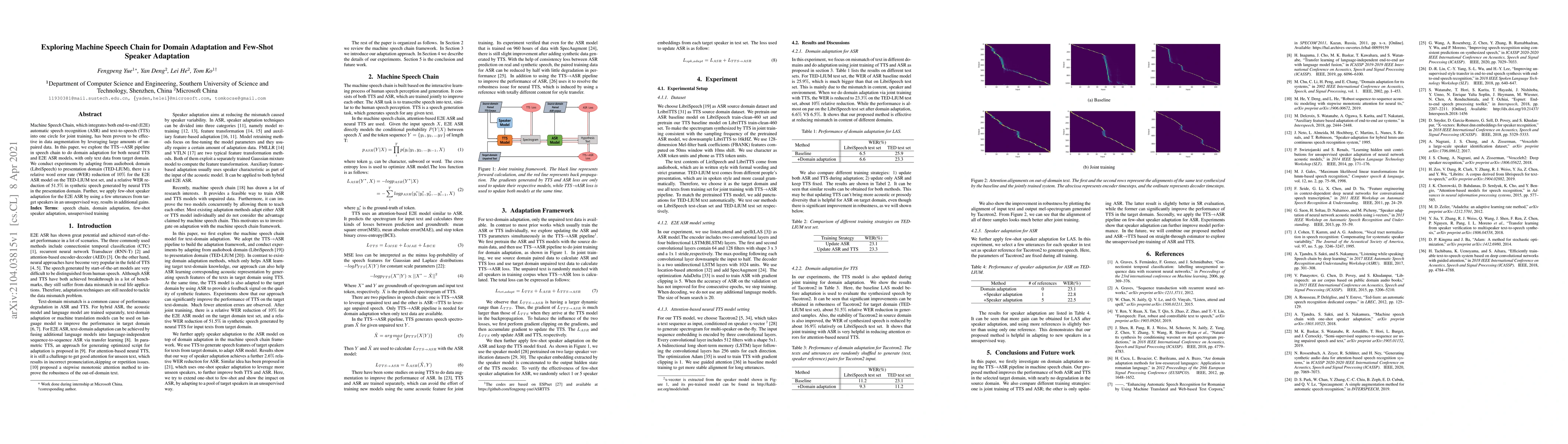 This paper investigates the Machine Speech Chain for domain adaptation and few-shot speaker adaptation, achieving a 10% reduction in word error rate for E2E ASR models and a 51.5% reduction in WER for neural TTS in the presentation domain. Few-shot speaker adaptation further enhances E2E ASR performance using minimal target speaker data.
