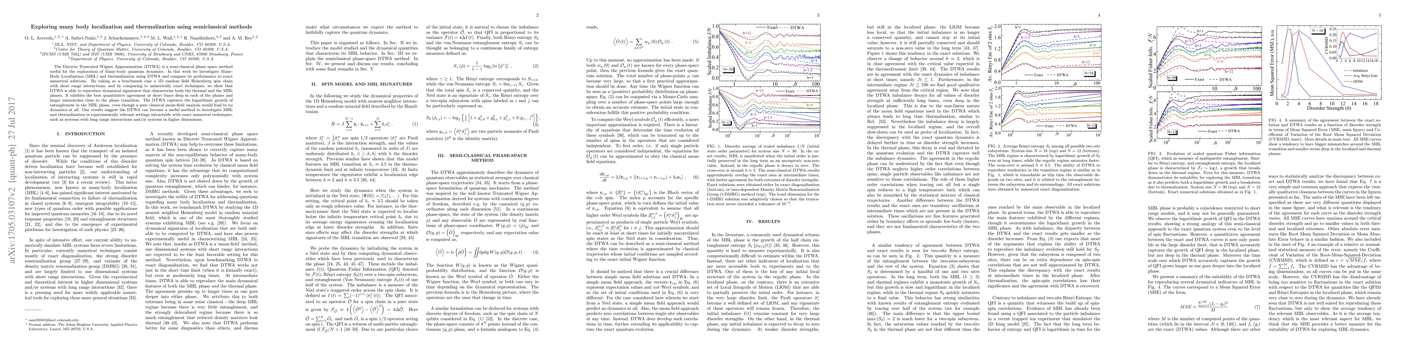 This paper explores Many-Body Localization (MBL) and thermalization using the Discrete Truncated Wigner Approximation (DTWA), demonstrating its ability to reproduce dynamical signatures of both phases in a 1D random field Heisenberg spin chain. The DTWA shows best agreement at short times and captures the logarithmic growth of entanglement in the MBL phase, suggesting its utility for studying complex systems beyond exact numerical methods.