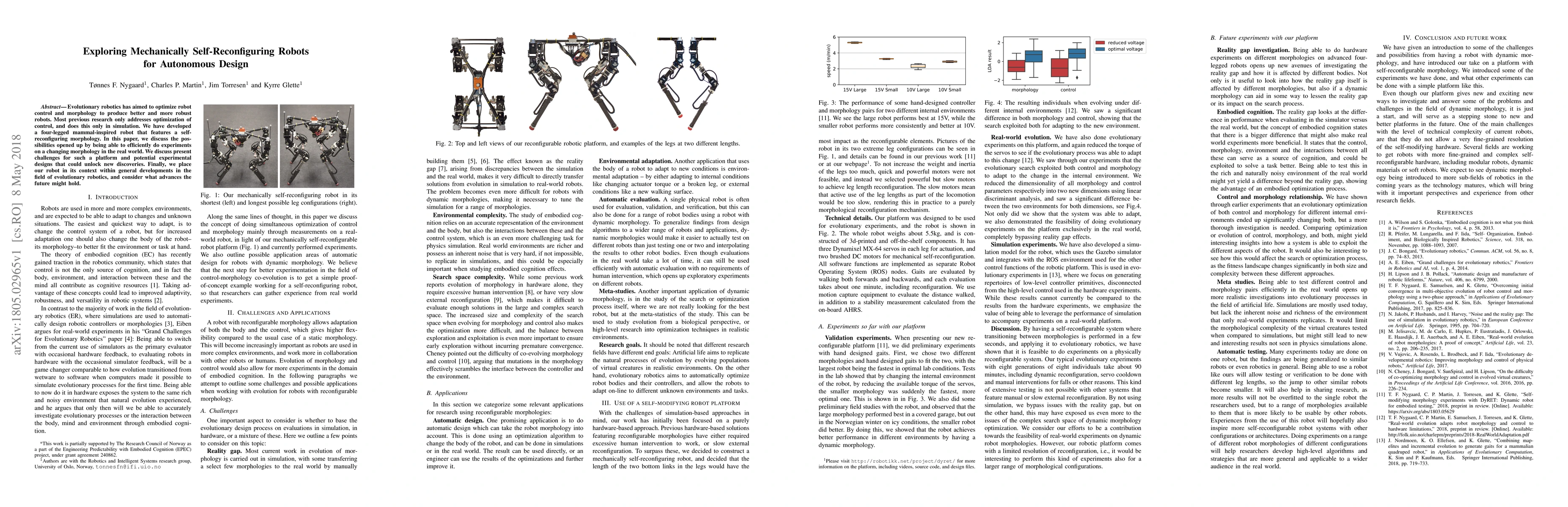The development of a mechanically self-reconfiguring robot platform and its application in evolutionary experiments for adapting to varying internal environments.