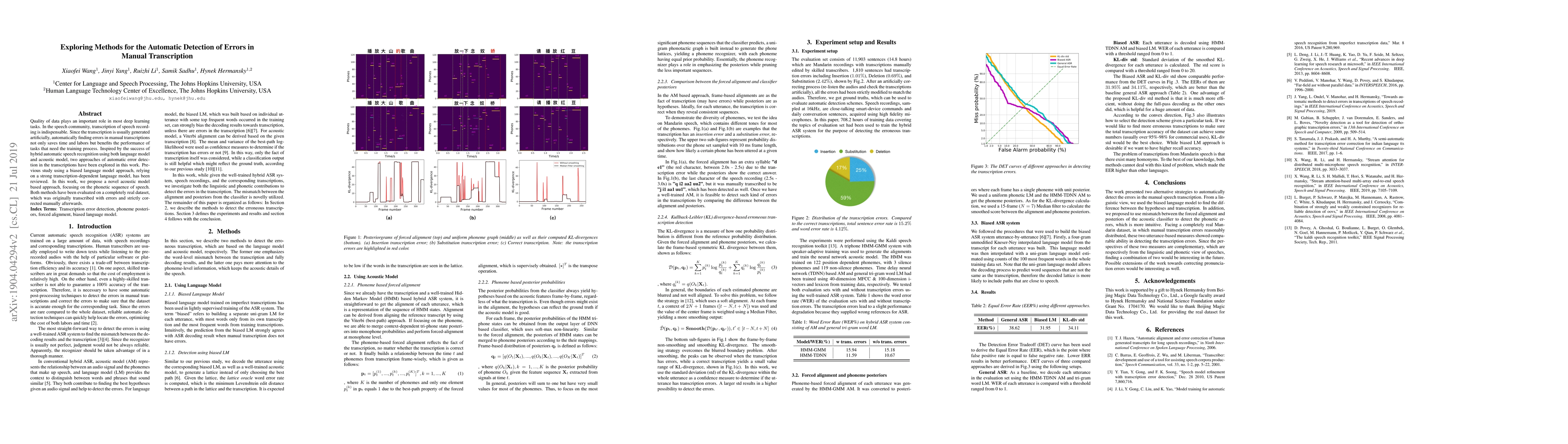This paper explores two methods for automatically detecting errors in manual transcriptions: a biased language model approach and a novel acoustic model based approach focusing on phonetic sequences. Both methods were evaluated on a dataset with intentionally introduced and manually corrected transcription errors.
