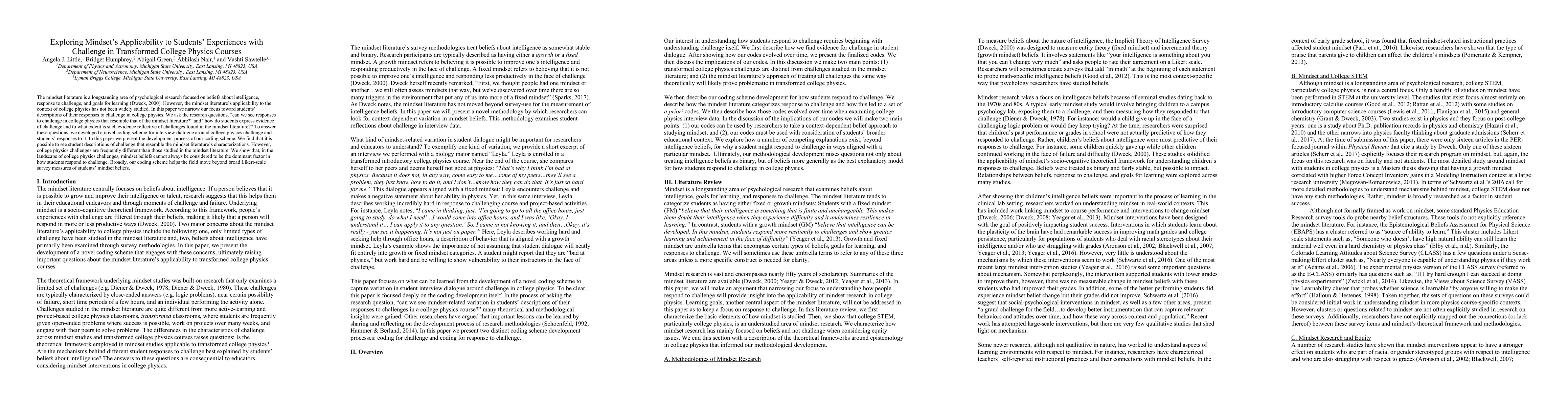 This paper explores the applicability of mindset theory to students' experiences with challenge in transformed college physics courses. The study develops a novel coding scheme to analyze interview data, finding that while some student responses align with mindset literature, college physics challenges often diverge, indicating mindset beliefs are not always the primary factor in student responses.