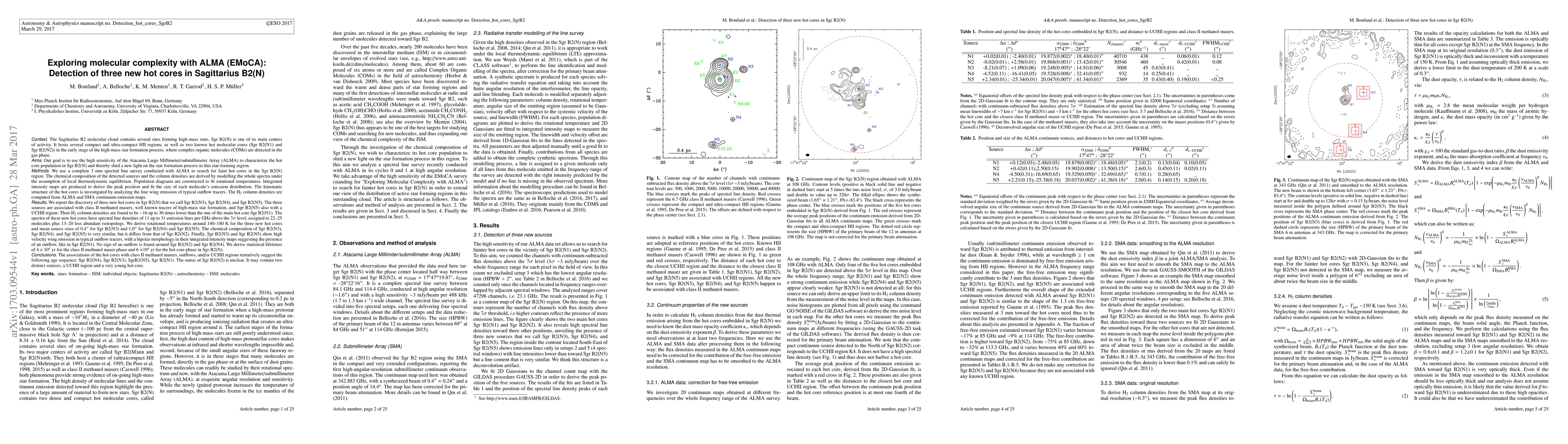 The EMoCA project with ALMA discovered three new hot cores in SgrB2(N), labeled SgrB2(N3), SgrB2(N4), and SgrB2(N5), each associated with class II methanol masers and possibly outflows, indicating ongoing high-mass star formation. These new hot cores exhibit lower H2 column densities and higher rotational temperatures compared to the main SgrB2(N1) hot core.