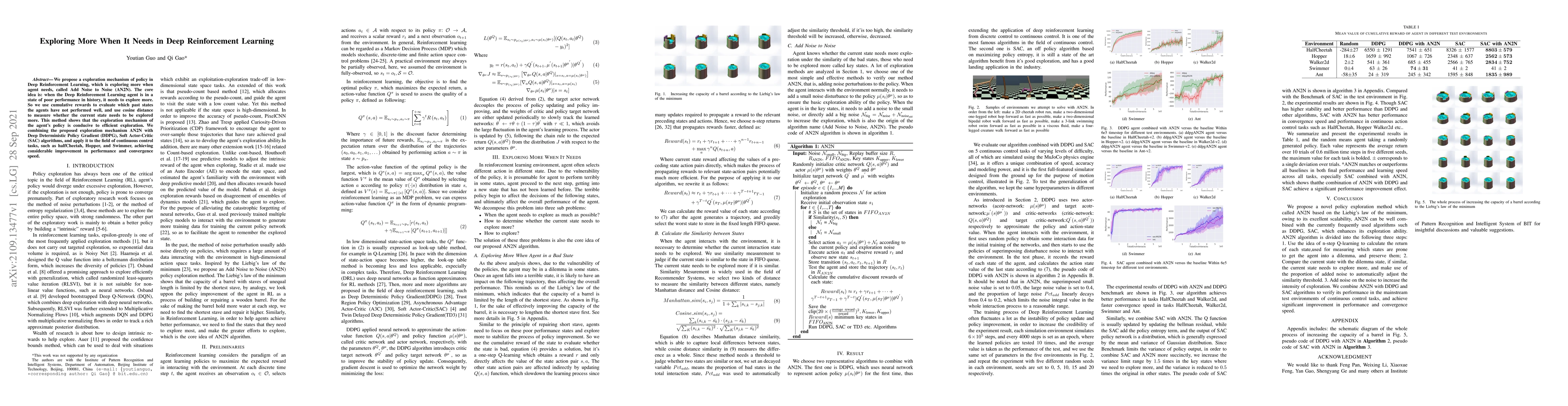 The research proposes an exploration mechanism called Add Noise to Noise (AN2N) for Deep Reinforcement Learning, which increases exploration when an agent performs poorly in past states, evaluated using cumulative rewards and cosine distance. AN2N is combined with DDPG and SAC algorithms for continuous control tasks.