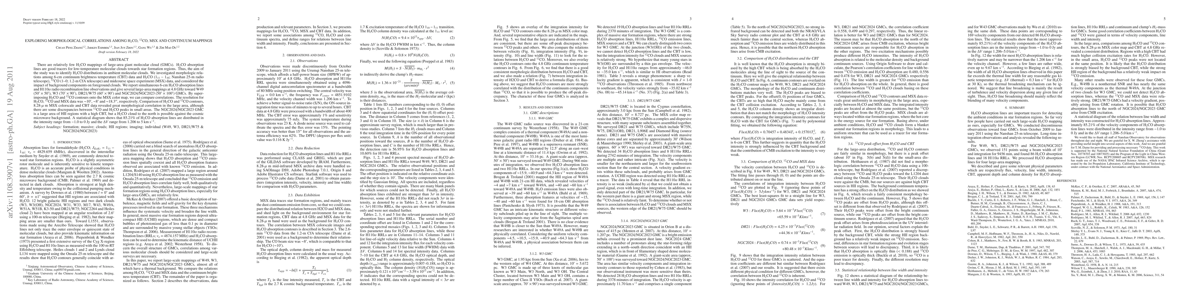 This study explores the morphological relationships between H2CO, 12CO, MSX, and 6-cm continuum brightness temperature (CBT) data in giant molecular clouds (GMCs). Utilizing large-area mappings of W49, W3, DR21/W75, and NGC2024/NGC2023 GMCs, researchers found strong correlation in the overall morphology, despite some discrepancies in small areas. The NGC2024/NGC2023 GMC, rich in HII regions, displays a high CBT but also a distinct H2CO cloud against the cosmic microwave background. The analysis reveals that 85.21% of H2CO absorption lines fall within specific intensity and velocity ranges.