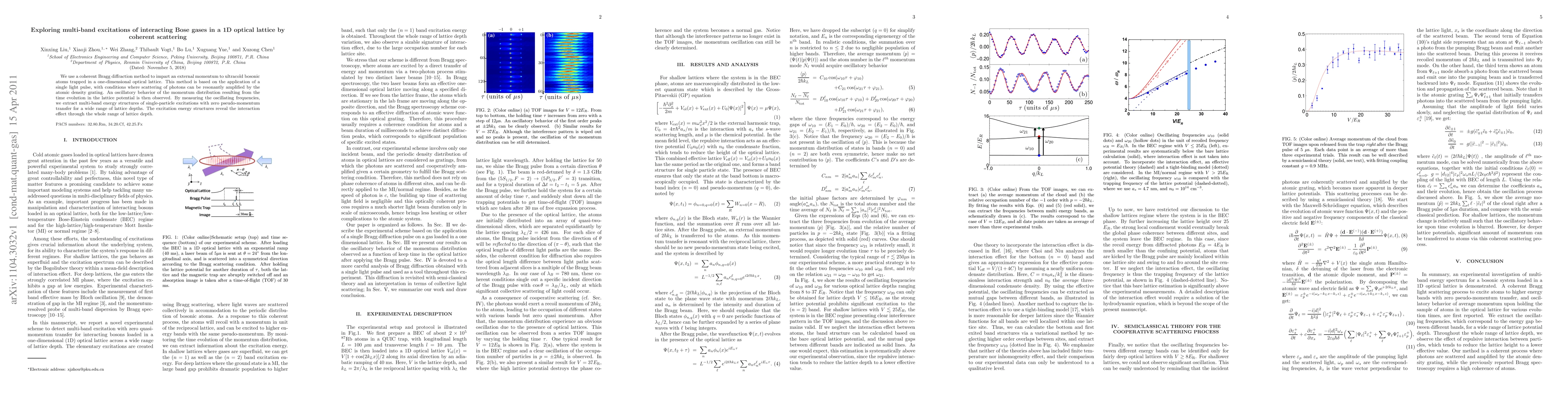 We use a coherent Bragg diffraction method to impart an external momentum to ultracold bosonic atoms trapped in a one-dimensional optical lattice. This method is based on the application of a single light pulse, with conditions where scattering of photons can be resonantly amplified by the atomic density grating. An oscillatory behavior of the momentum distribution resulting from the time evolution in the lattice potential is then observed. By measuring the oscillating frequencies, we extract multi-band energy structures of single-particle excitations with zero pseudo-momentum transfer for a wide range of lattice depths. The excitation energy structures reveal the interaction effect through the whole range of lattice depth.