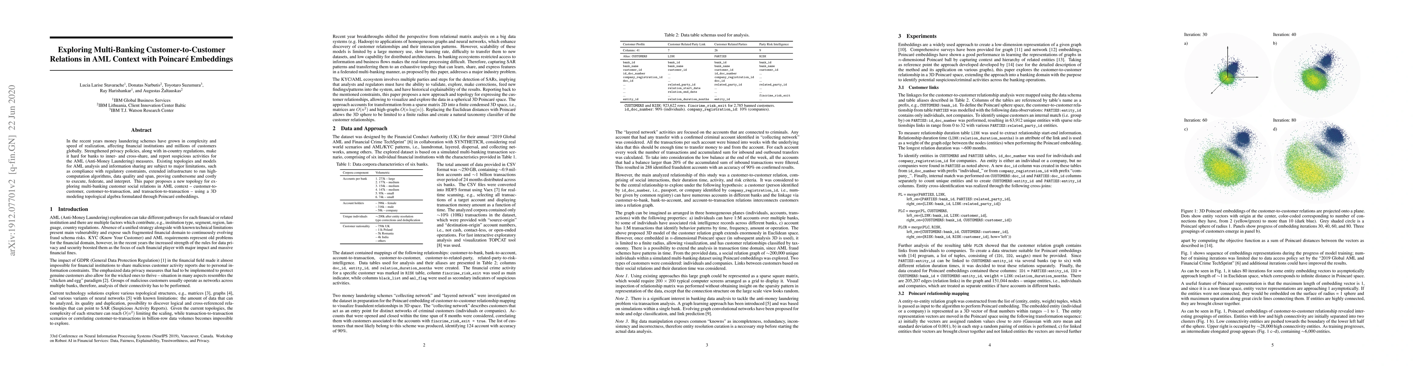 This paper proposes a novel 3D modeling approach using Poincar\'e embeddings to explore complex multi-banking customer-to-customer relations in the context of Anti-Money Laundering (AML) measures, aiming to overcome existing limitations in data sharing and analysis.