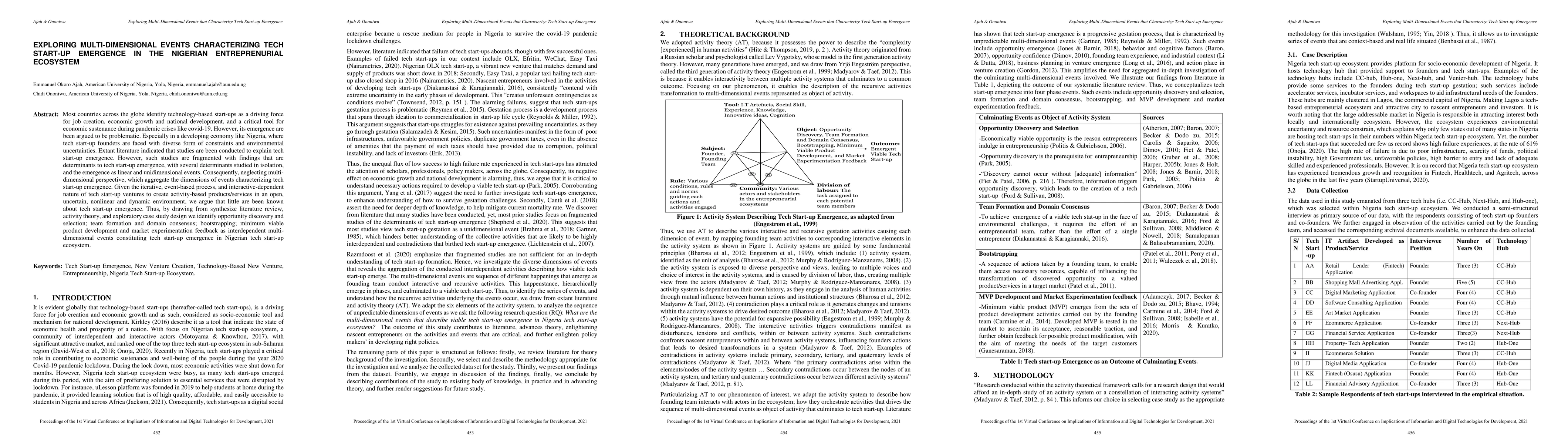 This study explores the emergence of tech start-ups in Nigeria's entrepreneurial ecosystem, identifying key multi-dimensional events that facilitate their creation, including opportunity discovery, team formation, and market experimentation. The research highlights the importance of considering these interdependent events to understand the complex process of tech start-up emergence.