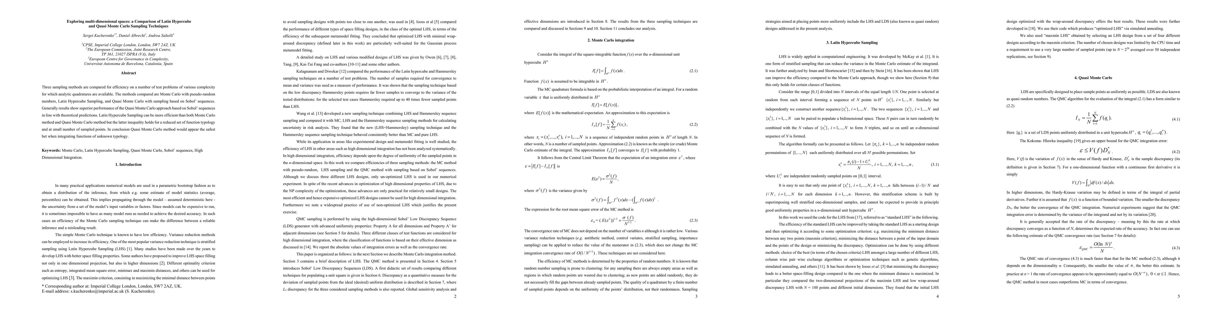 This paper compares the efficiency of three sampling techniques—Monte Carlo, Latin Hypercube Sampling, and Quasi Monte Carlo using Sobol sequences—on various test problems. The results indicate that Quasi Monte Carlo generally outperforms the others, while Latin Hypercube Sampling can be more efficient for specific functions and small sample sizes.