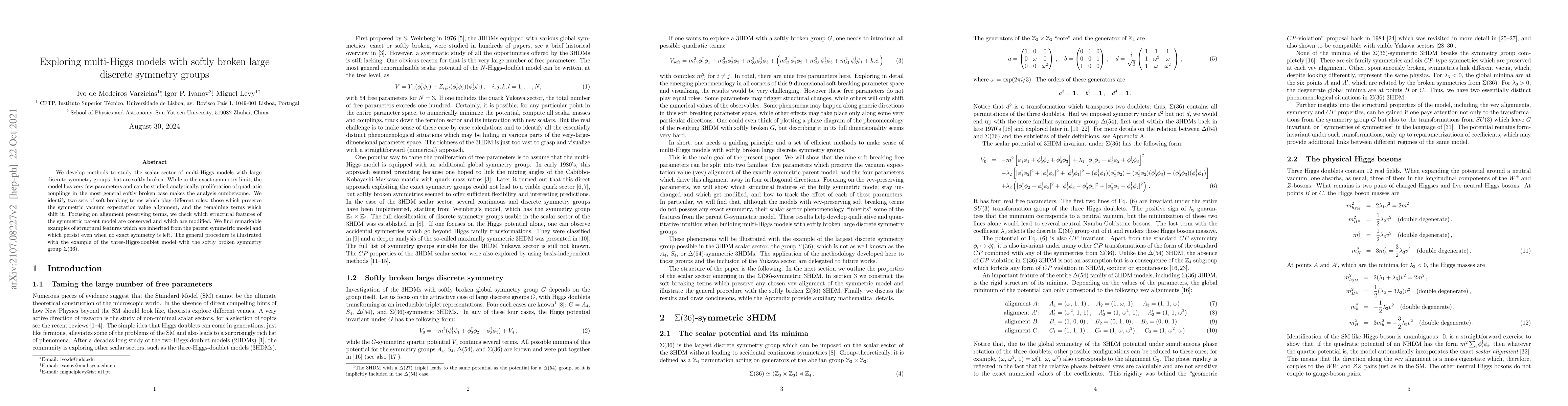 Researchers developed methods to study multi-Higgs models with softly broken large discrete symmetry groups, finding that certain structural features persist even when exact symmetry is lost.