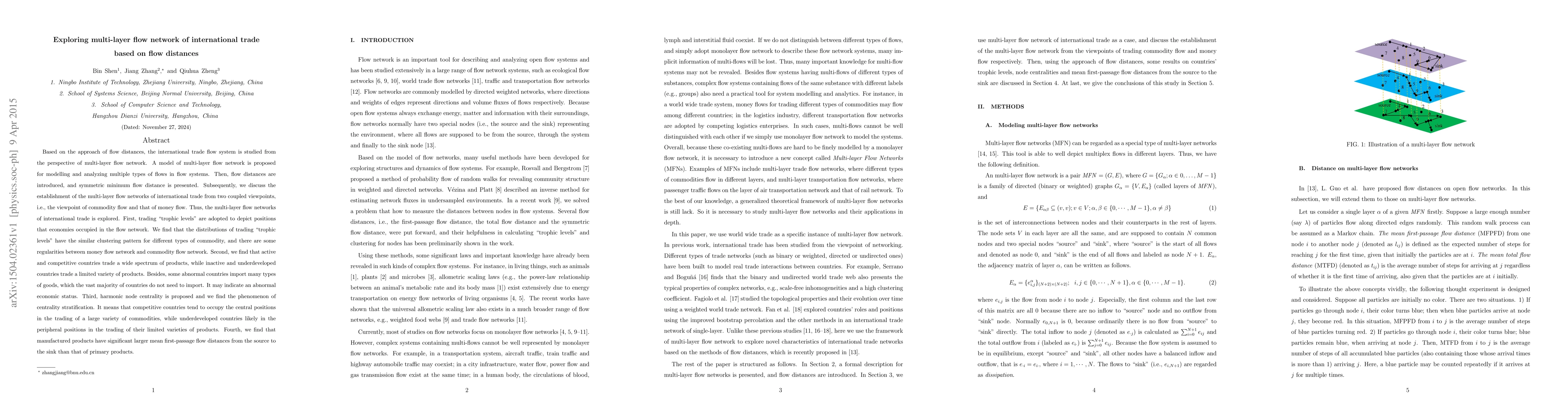 This paper proposes a multi-layer flow network model to analyze international trade flows, focusing on flow distances and the interplay between commodity and money flows. It identifies trading "trophic levels," centrality stratification, and significant differences in flow distances for manufactured versus primary products.